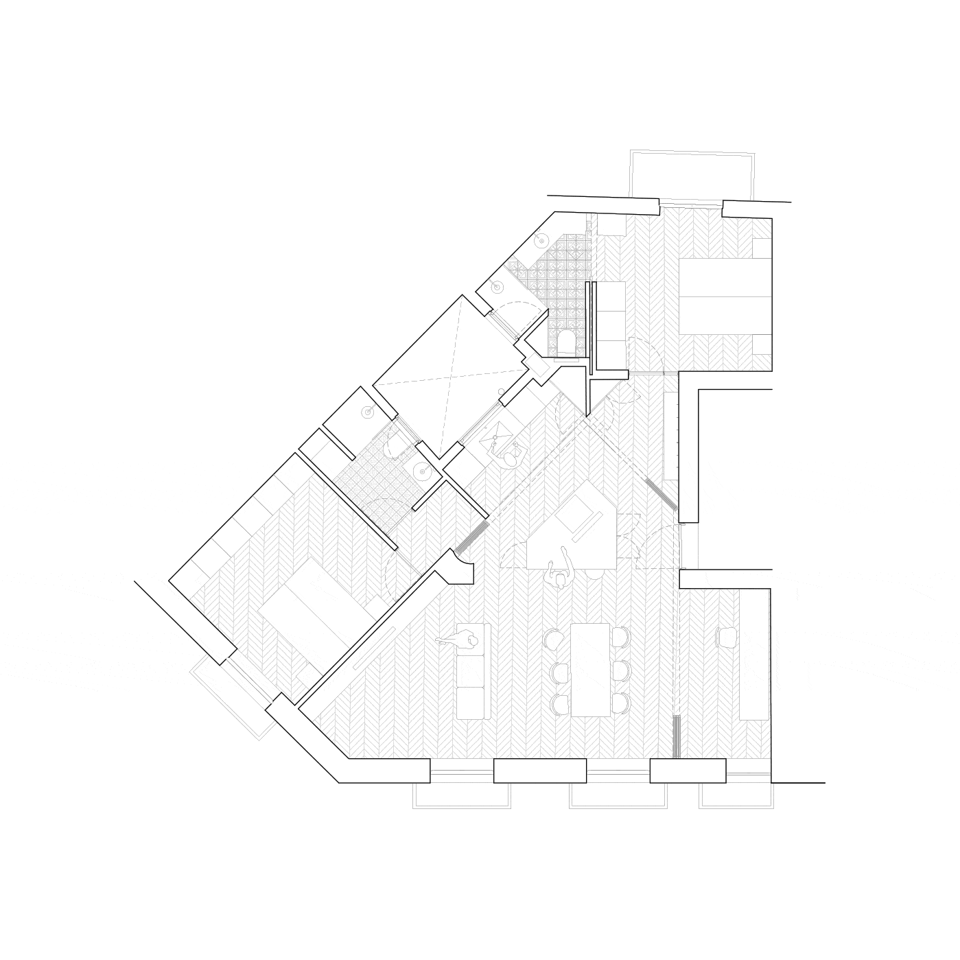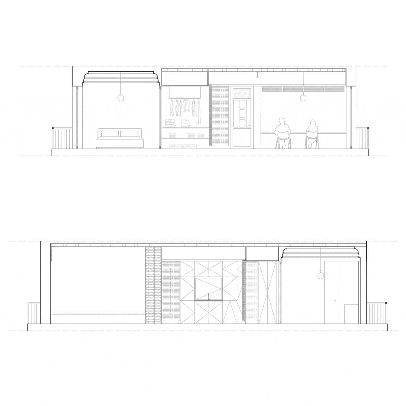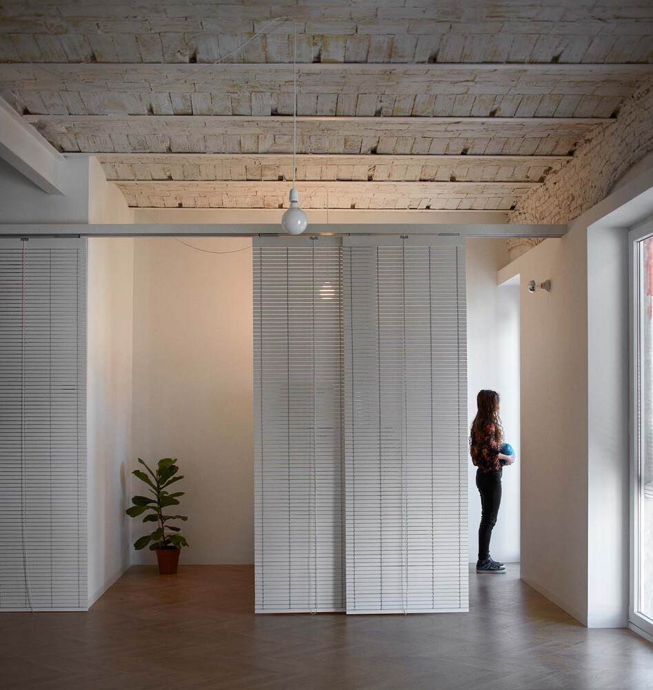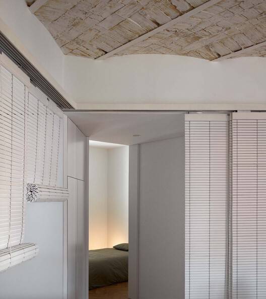 该空间被剥光了,消除了状况不佳的隔墙、覆层和假天花板,使原始结构暴露在外。入口处是公共区域,通过这些区域可以进入其他房间。传统的阿利坎特百叶窗的使用划定了公寓的公共区域,除了解决了中心空间中存在的不同对齐问题外,还提供了灵活性,并为每个空间提供了必要的亲密度。