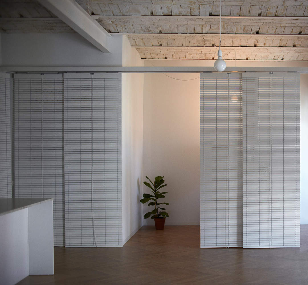 The space is stripped bare, eliminating partitions, cladding and false ceilings in poor condition, leaving the original structure uncovered. At the entrance are the common areas through which the rest of the rooms are accessed. The use of the traditional Alicante shutter delimits the public area of the flat and, in addition to resolving the different alignments existing in the central space, provides flexibility and gives the necessary degree of intimacy to each space.