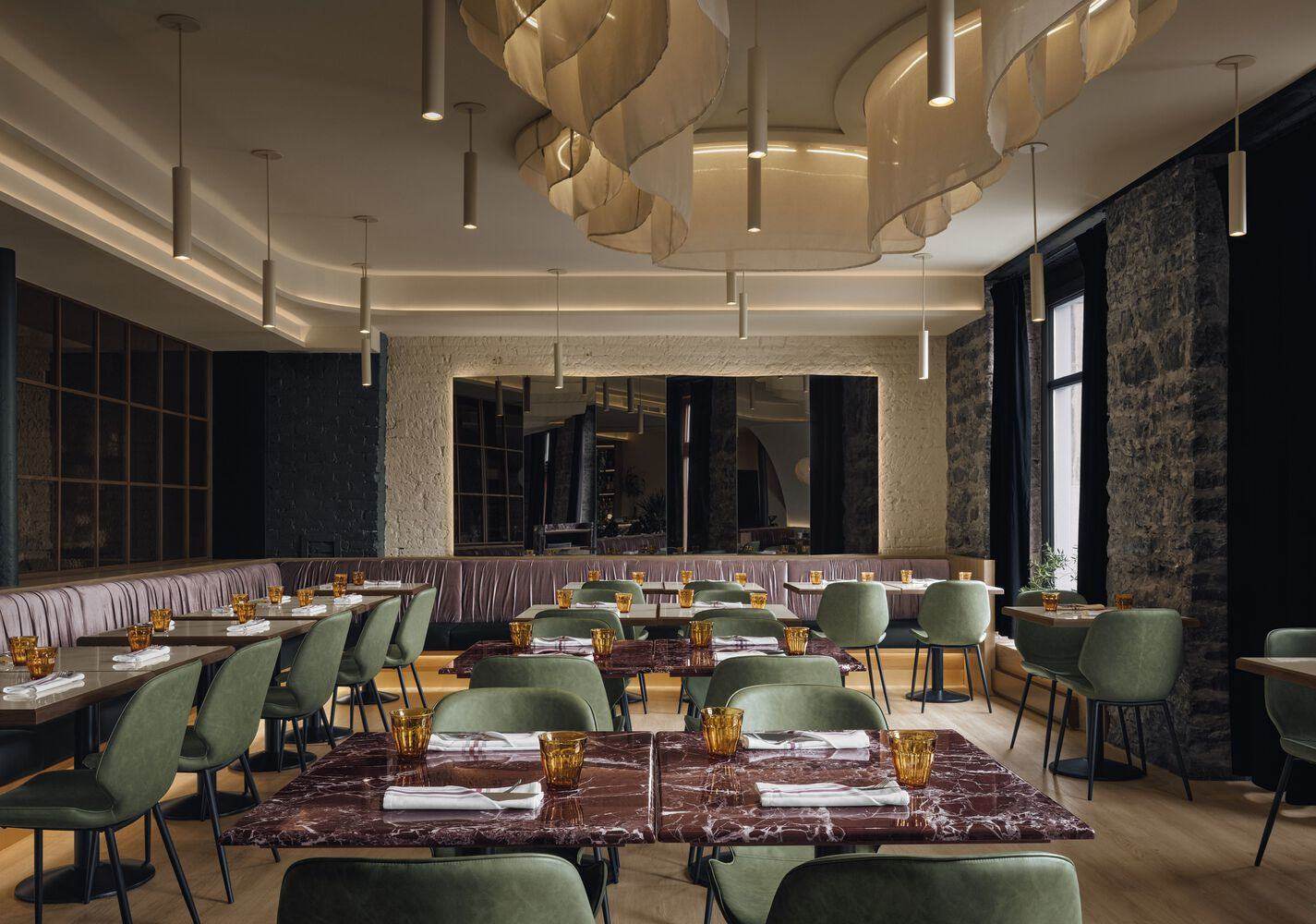这个1500平方英尺的空间有一个主餐厅、一个酒吧、一个厨房和私人卫生间。用餐区是一个开放的空间,有木地板和零散的桌子。上图中,一系列弯曲的织物横幅聚集在一起,形成了一个中央灯具,周围环绕着几个光滑的米色吊坠。围绕这个空间,一条长长椅沿着围墙延伸,为较大的团体设置了两个私人包厢。每个座位都用森林绿色的皮革装饰,靠背则用丝绸般的粉红色天鹅绒。就在后面,厨房和餐厅被胡桃木和锤纹玻璃隔断隔开,只露出服务过程中发生的动作。