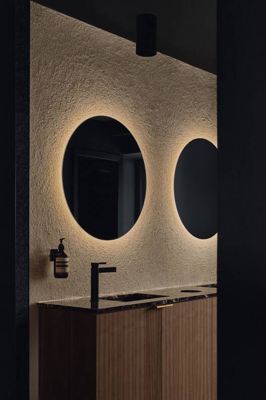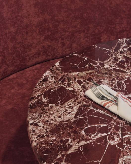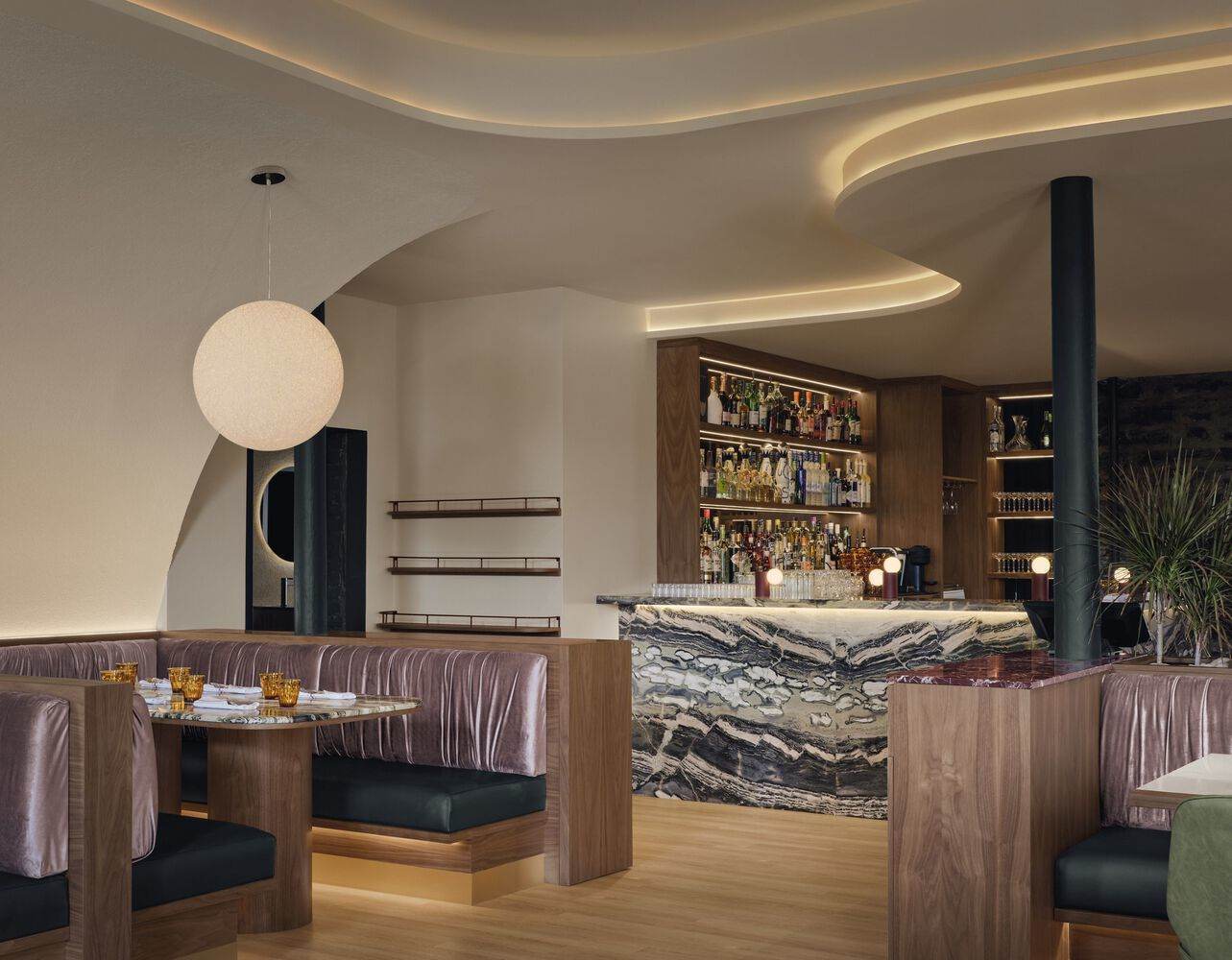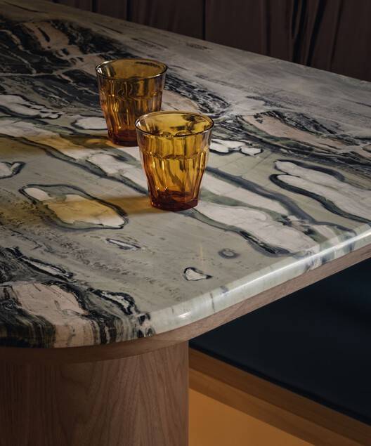 所有的木制品都是用天然黑胡桃木建造的。除了酒吧,桌子和服务站上还摆放着另外两块大理石,每块大理石都为空间增添了自己的色彩。除了中央灯具和分散的吊灯,房间里的一般照明还来自许多间接光源。无论是在天花板上、墙壁后面还是在木制品下面,多个昏暗的线性灯都会聚集在一起,在整个餐厅营造出一种诱人的温暖光芒。
