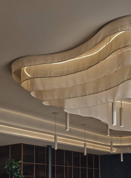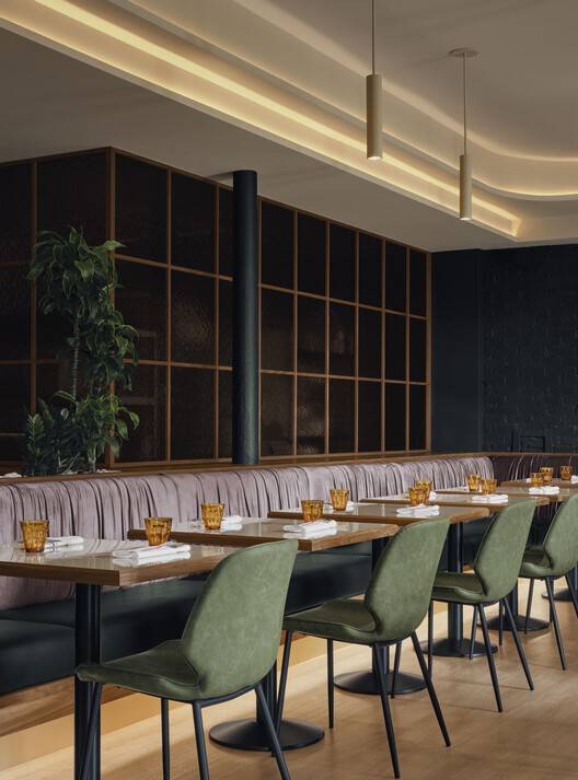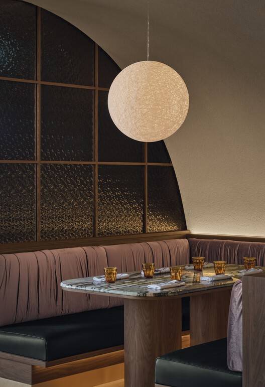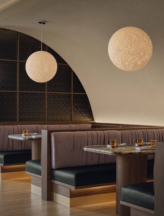 空间布局与功能设计:1500平方英尺的空间被合理划分为主餐厅、酒吧、厨房和私人卫生间。用餐区采用开放式的布局,木地板与零散的桌子营造出舒适的用餐环境。中央的弯曲织物灯具和米色吊坠灯具成为视觉焦点,而长椅和私人包厢的设置则满足了不同规模团体的需求。厨房与餐厅之间用胡桃木和锤纹玻璃隔断,既保证了空间的通透性,又巧妙地隐藏了烹饪过程中的杂乱。