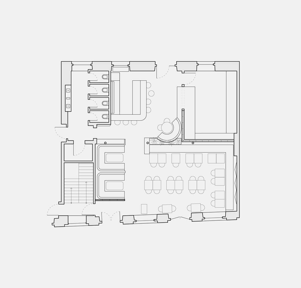 This Middle Eastern restaurant's colour palette was inspired by the earthy tones of the Syrian deserts and their surrounding greenery. The sinuous ceiling lines mimic the smooth landscapes of the area, while guiding guests through the dining space. The entire ceiling and most walls were painted a warm and inviting cream colour, while the existing structure and window frames were coated with a deep charcoal paint. The ancient stone walls at the front and rear façades were, on the other hand, left intact to showcase the building's history.
