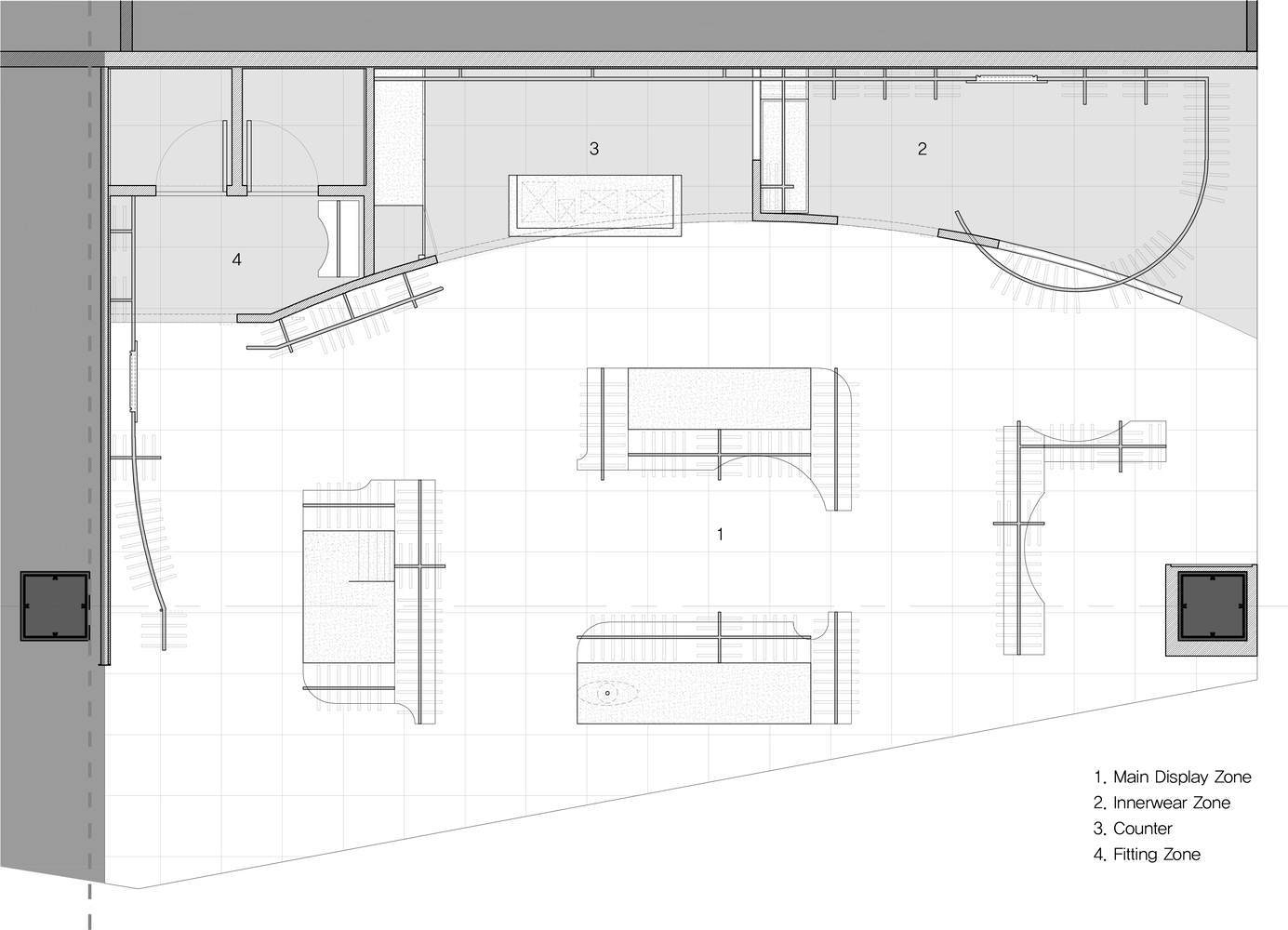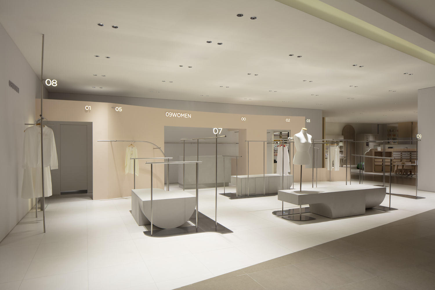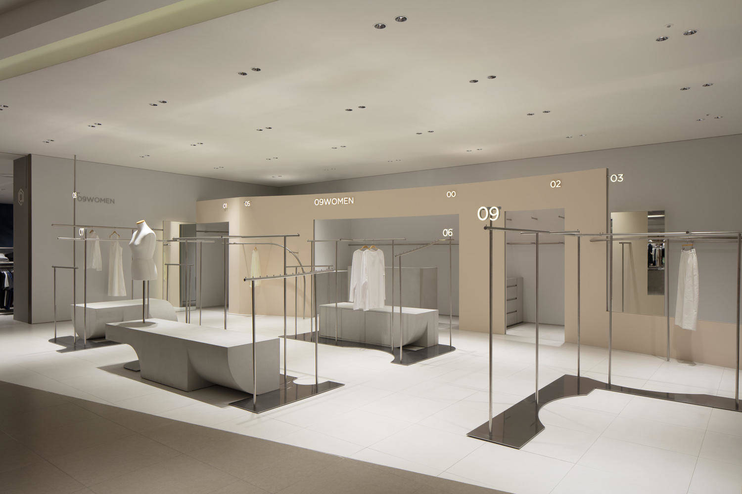 空间设计与品牌理念融合:09WOMEN水原店的空间设计巧妙地呼应了品牌对多样性和包容性的追求。通过将数字0到9的曲线融入墙壁、固定装置和标牌设计,不仅赋予了每个数字独特的风格意义,还为顾客营造出一种直观且无缝的购物体验。这种设计手法不仅体现了品牌的创新精神,也强化了空间的识别度和记忆点,使顾客在购物过程中自然地感受到品牌的文化内涵。