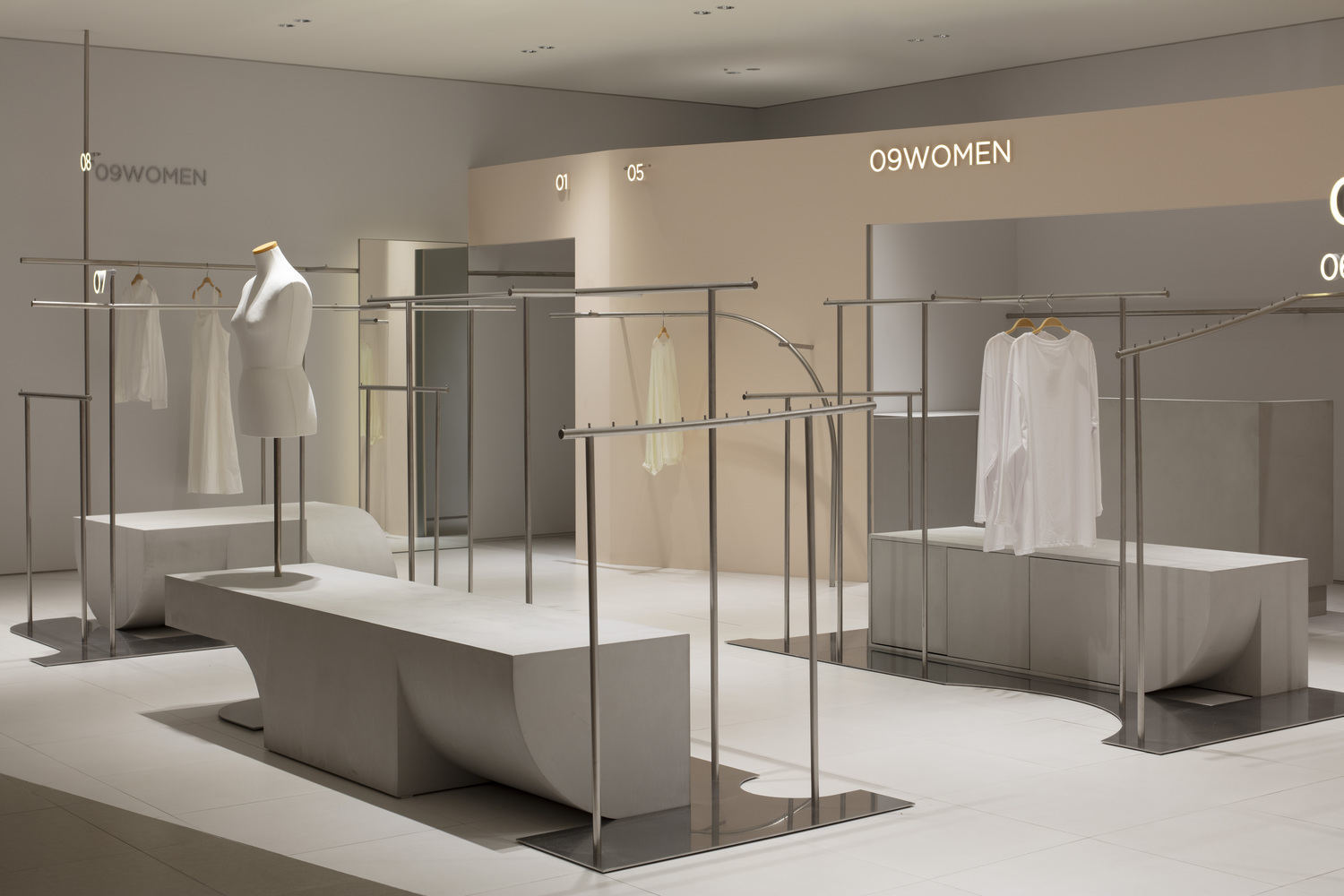 Originally, "09WOMEN" referred to group purchasing, but we've redefined it to represent freedom in choosing clothing, regardless of body type. We have given meaning to each digit from 0 to 9 by introducing ten distinct styles and identities for every woman to explore. This reinterpretation reflects our brand's identity, curating a space that highlights diverse styles and offers customers an intuitive and seamless shopping experience. We emphasize the graceful curves of the numbers, integrating these curves into the design of walls, fixtures, and signage.