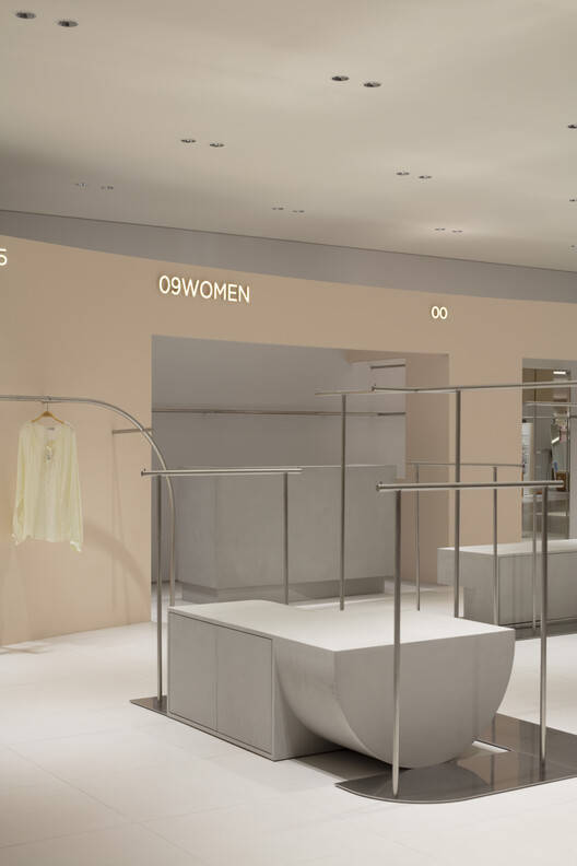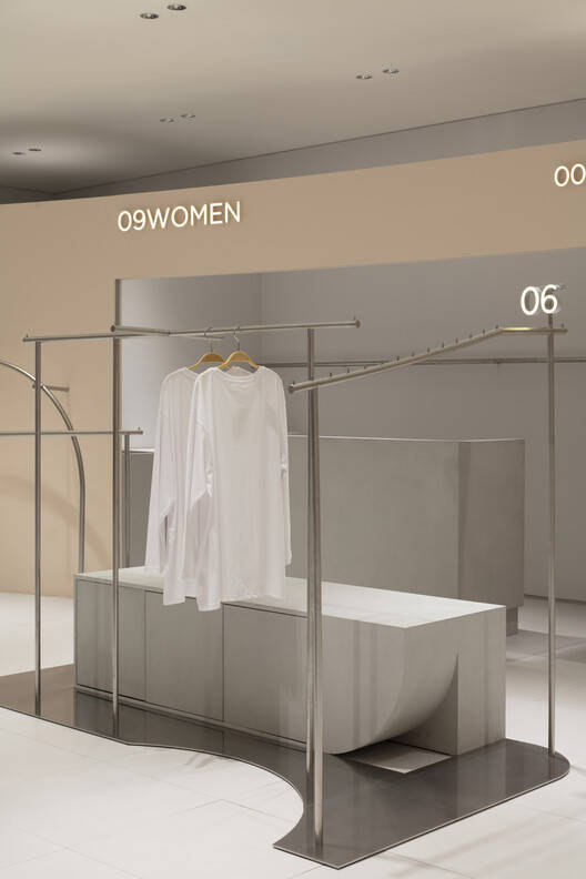 顾客体验与情感共鸣:09WOMEN水原店的设计注重顾客的情感体验。通过数字形状的灯光装置引导顾客的视线,使他们能够轻松地在墙上和衣架上找到心仪的物品。这种设计细节不仅提升了购物的便利性,更传递出一种对顾客的尊重和关怀。整个空间旨在让顾客自由表达个性,庆祝多样性的美丽,并对自己独特的身份充满信心,从而与顾客建立起深刻的情感共鸣。