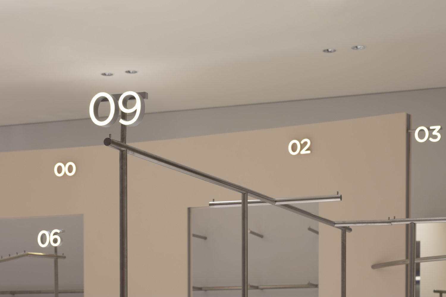 The choice of a neutral beige color, representing a broad spectrum of skin tones, creates a harmonious, borderless aesthetic. The space is thoughtfully divided: the front wall features product displays, while the back area houses functional zones such as the counter, fitting rooms, and innerwear section. Curved hangers that extend seamlessly from the walls provide an effortless way to categorize and display products. Number-shaped light installations guide customers' attention, making it easy to find items on both walls and hangers. We aim to create a space where everyone feels free to express their individuality, celebrate the beauty of diversity, and gain confidence in their unique identity.