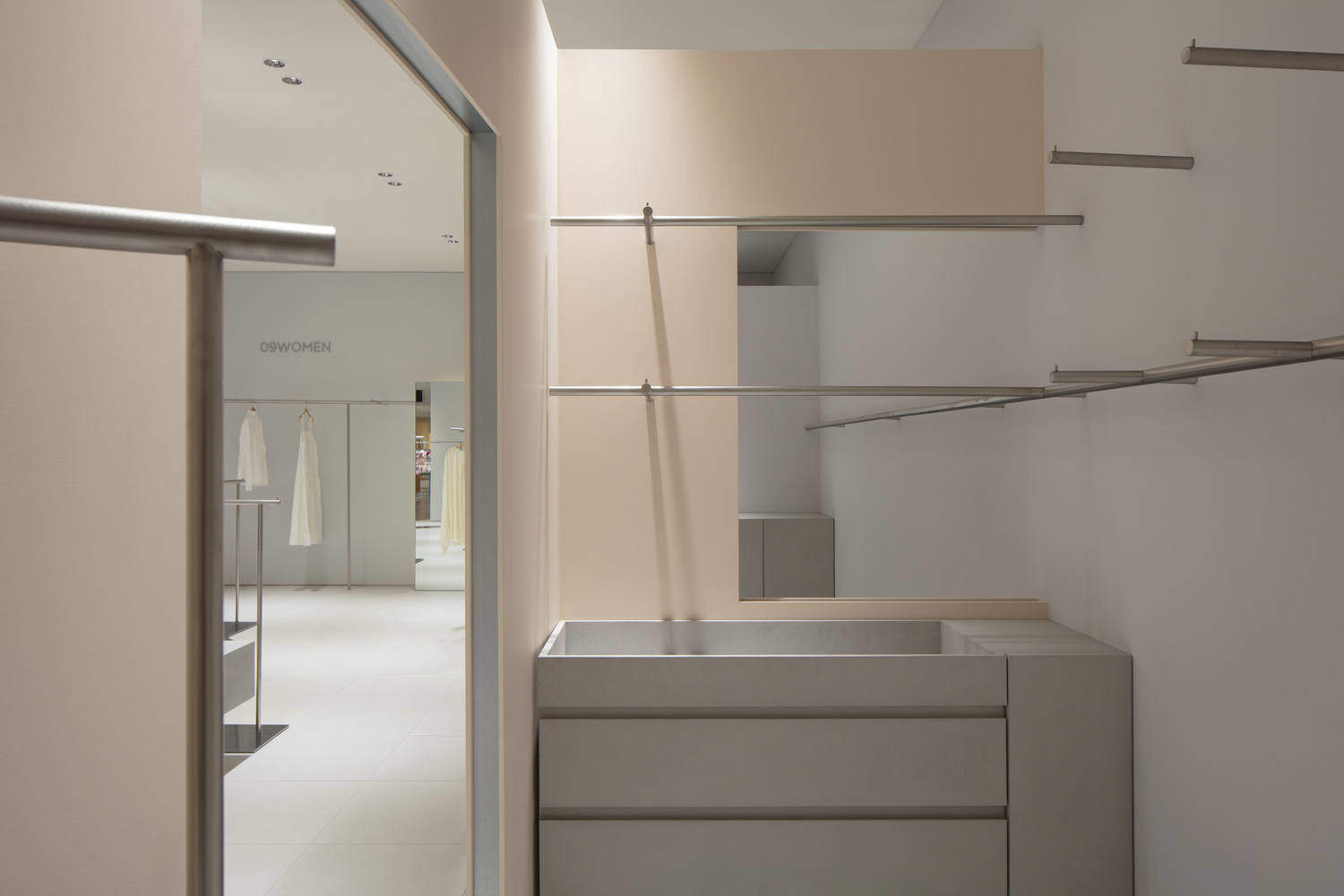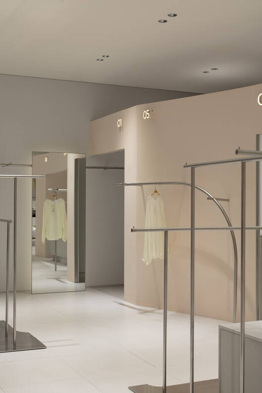 功能与美学的平衡:店内空间经过精心划分,前墙用于产品展示,后区则合理布局了柜台、试衣间和内衣区等功能区域。弧形衣架从墙面无缝延伸,不仅为产品分类和展示提供了便利,还增强了空间的流畅感和连贯性。此外,中性米色的色调选择象征着广泛的肤色,营造出一种和谐、无边界的美学,使空间设计在满足功能性的同时,也兼顾了美学表达。