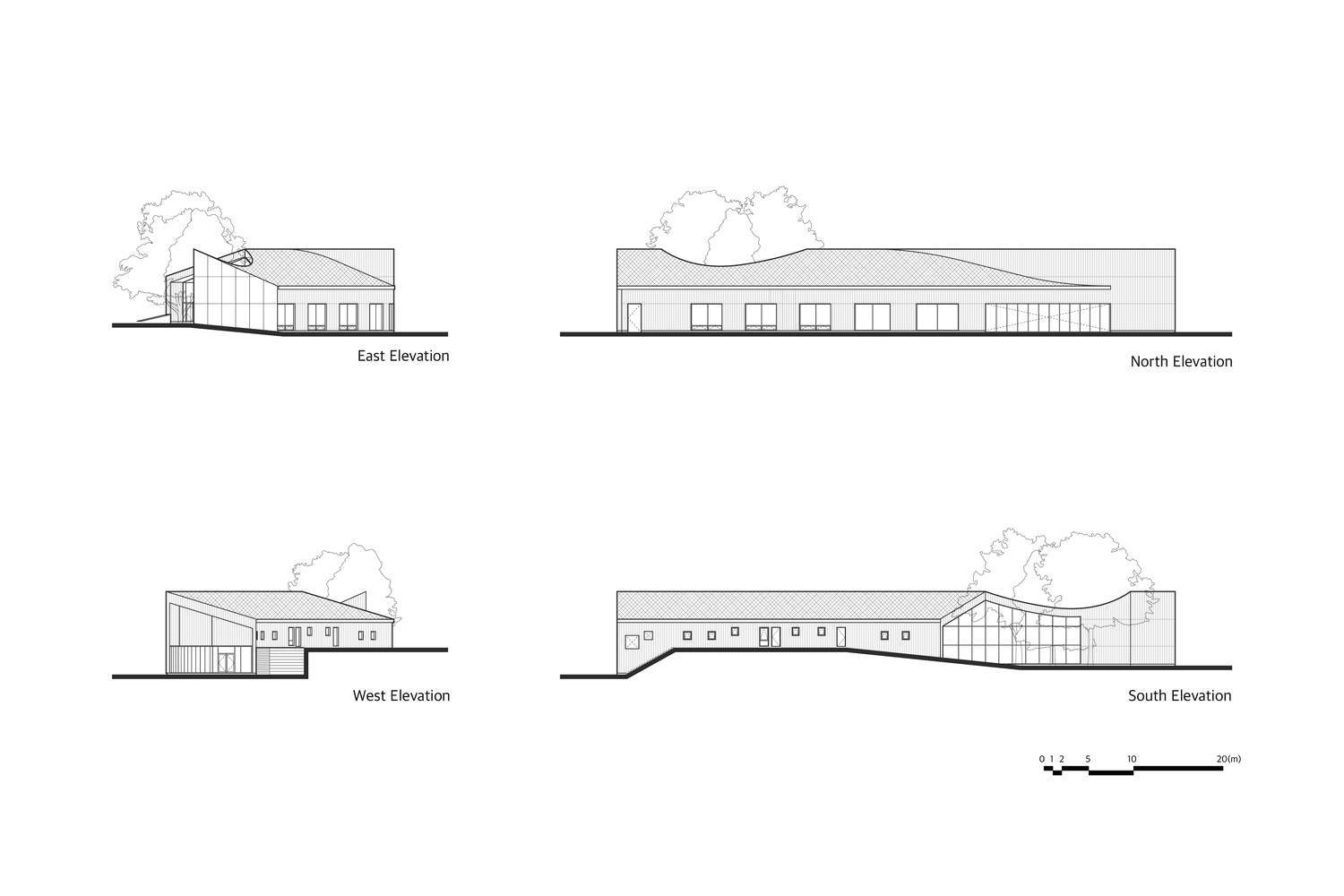 特别是,东南部的庭院,十棵受保护的树木中有三棵仍保留在那里,创造了一个切口空间,内部空间和外部自然通过全高幕墙相互交流。建筑的东立面是一个镜面,自然最终淹没了建筑。这种设计策略再次强调,这个项目不是为了庆祝建筑,而是为了庆祝随季节变化的自然之美。