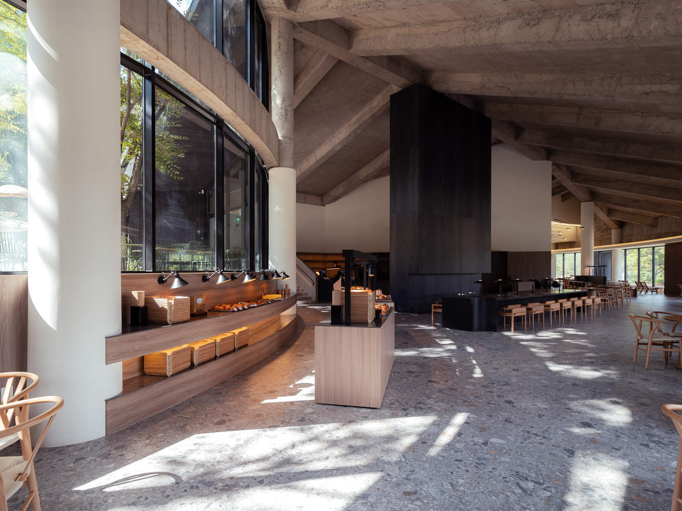 进入主入口,看着建筑的西端,暴露的屋顶结构有节奏地表达了上述建筑的弯曲形状。当你到达西部尽头时,游客会遇到一个完全被烧焦的木头覆盖的户外露台。这个露台是您最好欣赏烧焦木材质地的地方,也是您可以通过建筑缝隙欣赏大自然的外部空间。