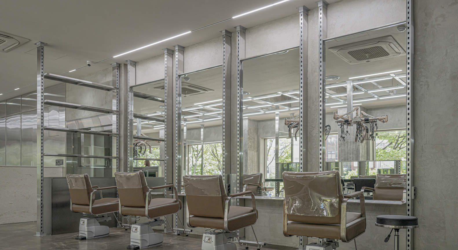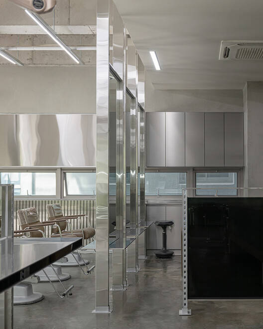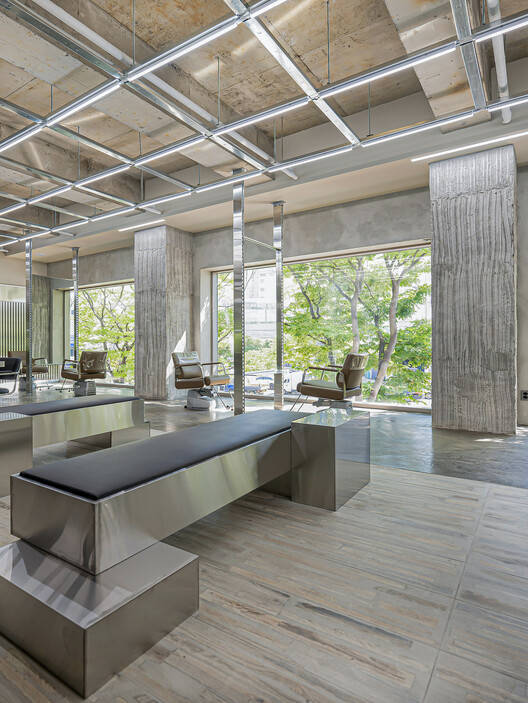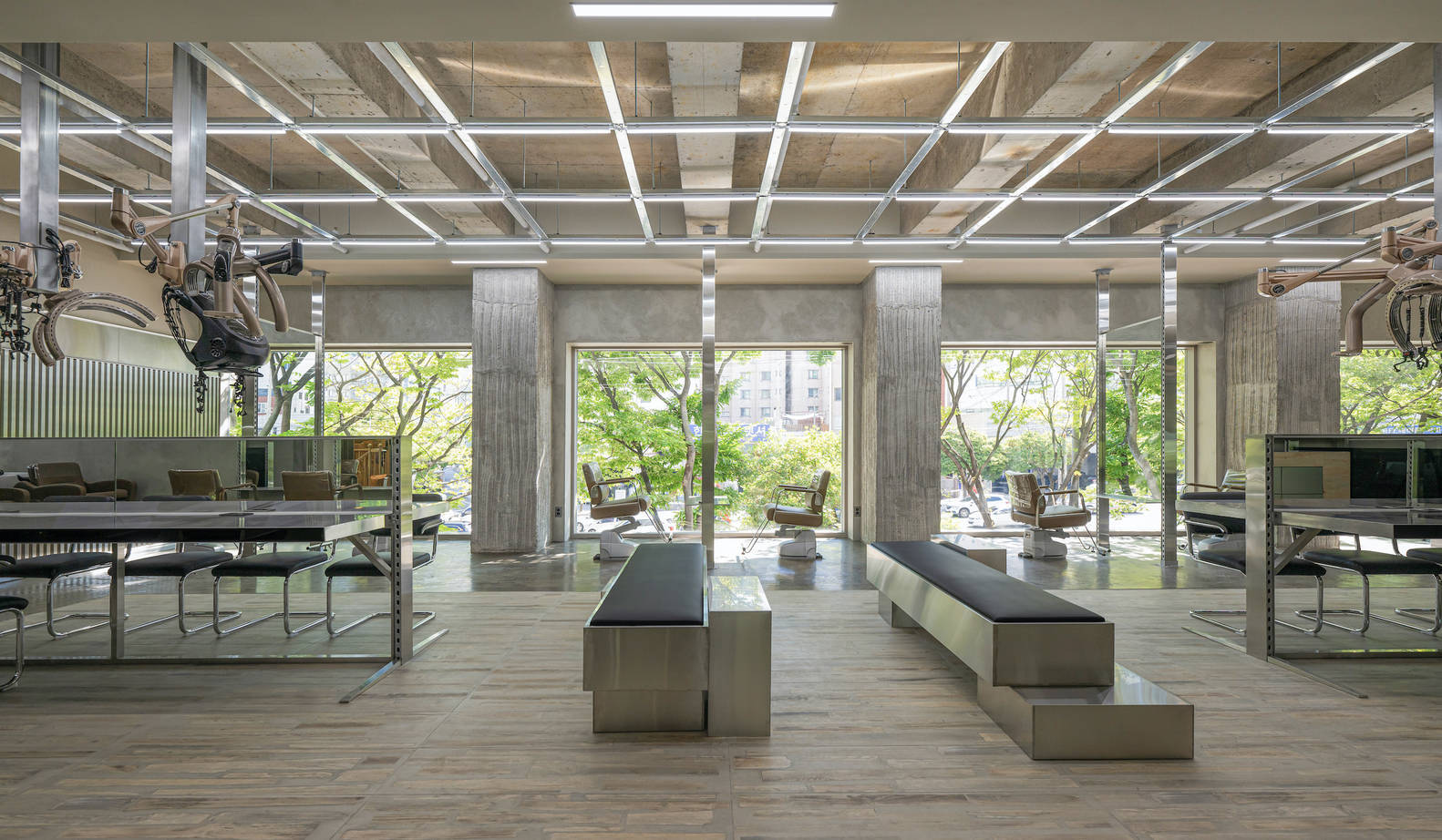 The theme of personal sensibility at Chaoreum Hair reflects a new approach to beauty salons, moving beyond traditional models to offer individualized services that stimulate the customers' senses by boosting self-satisfaction and confidence. Seeking to break away from conventional salon designs, Chaoreum Hair incorporated the unique characteristics of its location, where a blend of hardware shops and trendy commercial areas coexist. To express this new form and movement, the space was designed using its distinct shapes, raw materials, and local setting, reflecting the brand's identity and space.