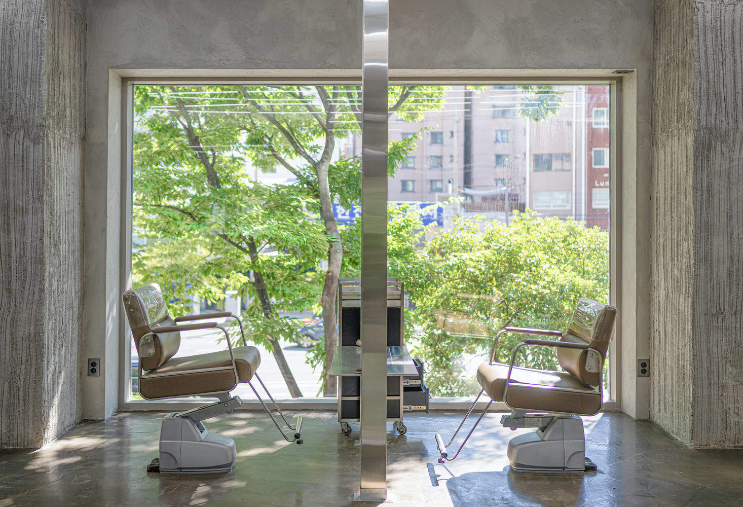 Designed for a different experience in accordance with the different spaces, Chaoreum Hair is divided into two main sections: the treatment area and the waiting area. The treatment area near the window has been opened up with large windows, replacing the previously bulky frames that obstructed the view. By incorporating nature, the space blends raw materials with the properties of nature, creating a richer sensory experience.
