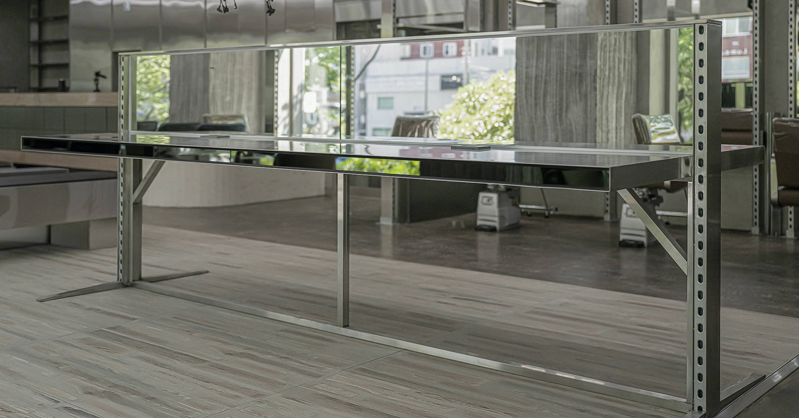 The overall atmosphere uses various materials, such as metal, vintage-style floors and walls, and trendy tiles. However, the space is balanced with a combination of gray and ivory tones, aiming for a harmony that is neither too cold nor too warm. The design of furniture and fixtures highlights the thin vertical and horizontal lines, and the main materials—metal, black glass, and mirrors—create a space that doesn't appear cold or bulky, making the space feel more expansive and efficient.