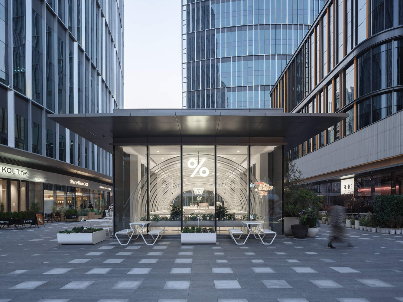 建筑师提供的文字描述这家阿拉比卡咖啡店周围环绕着许多商业塔楼和办公楼,以其作为放松和凉爽空间中心的优越位置而自豪。它欢迎来自四面八方的顾客,有室内和室外座位可供选择。