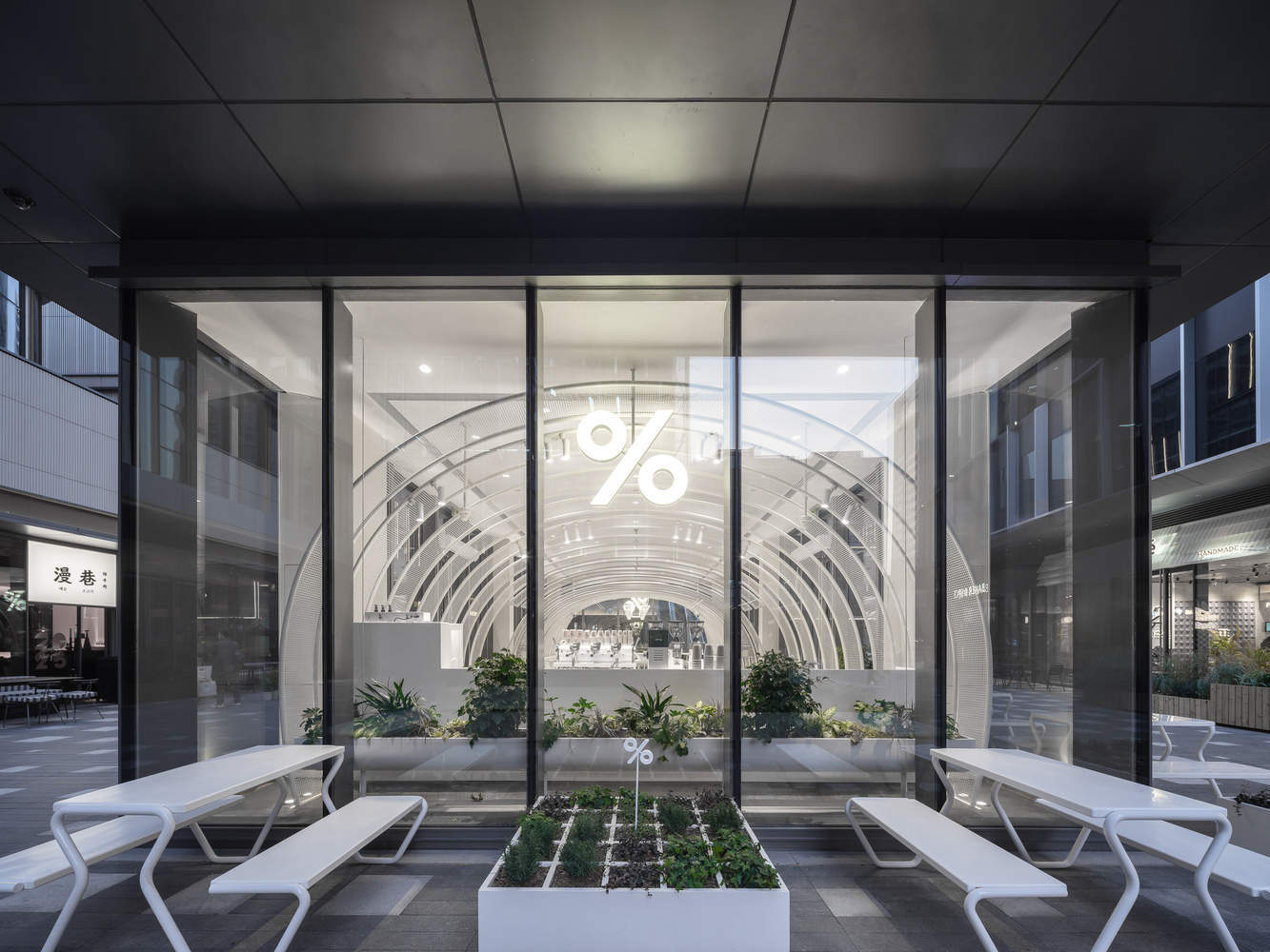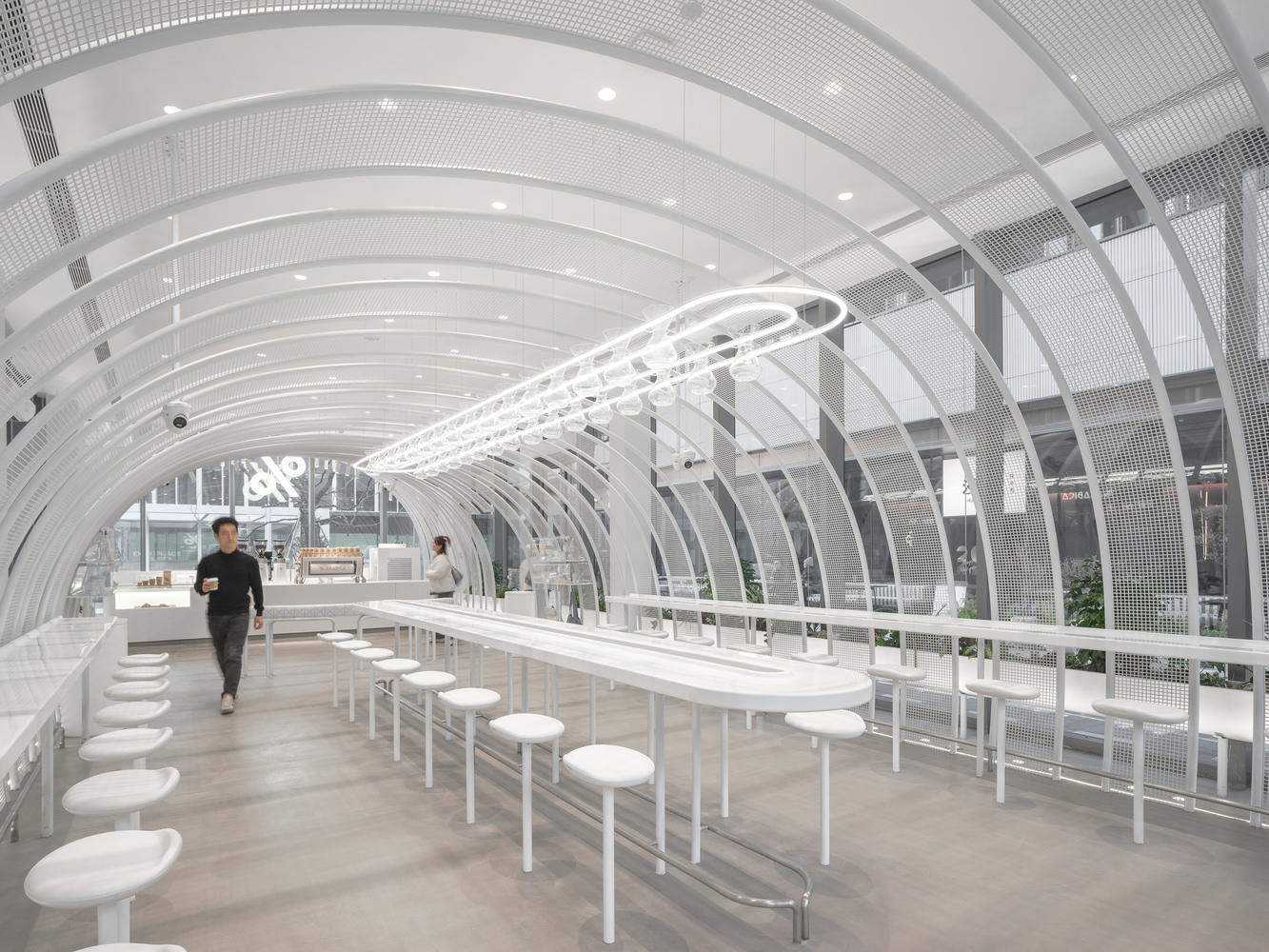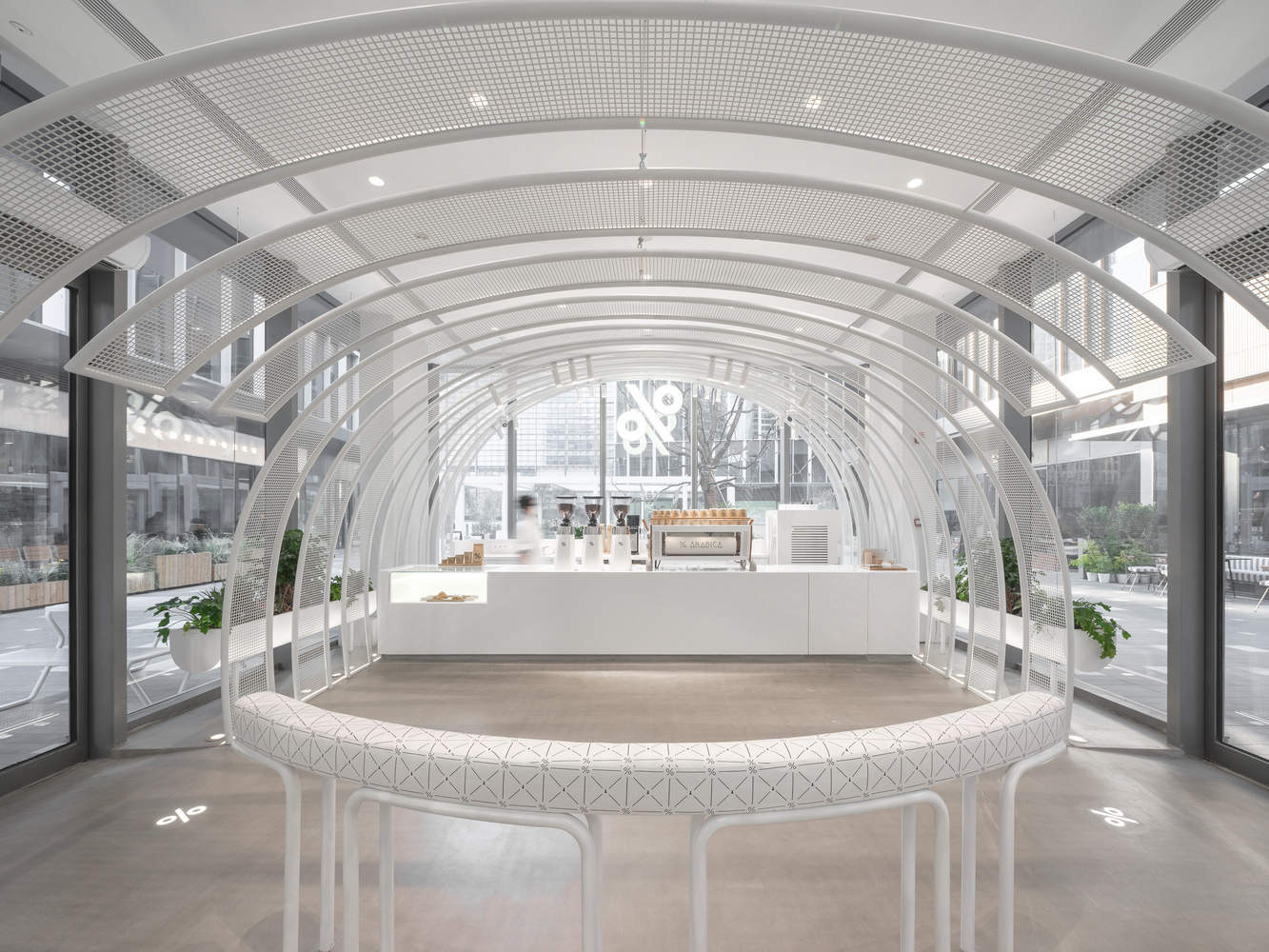 品牌与空间的深度融合:阿拉比卡咖啡店的设计成功地将品牌理念与空间设计相结合。从外观上看,白色隧道的设计在顾客移动时呈现出不同的视觉效果,增强了品牌的独特性。户外家具和格子式花盆的使用不仅补充了空间的功能性,还巧妙地保持了设计的焦点,避免了视觉上的杂乱。这种设计既满足了功能需求,又强化了品牌的视觉识别度。