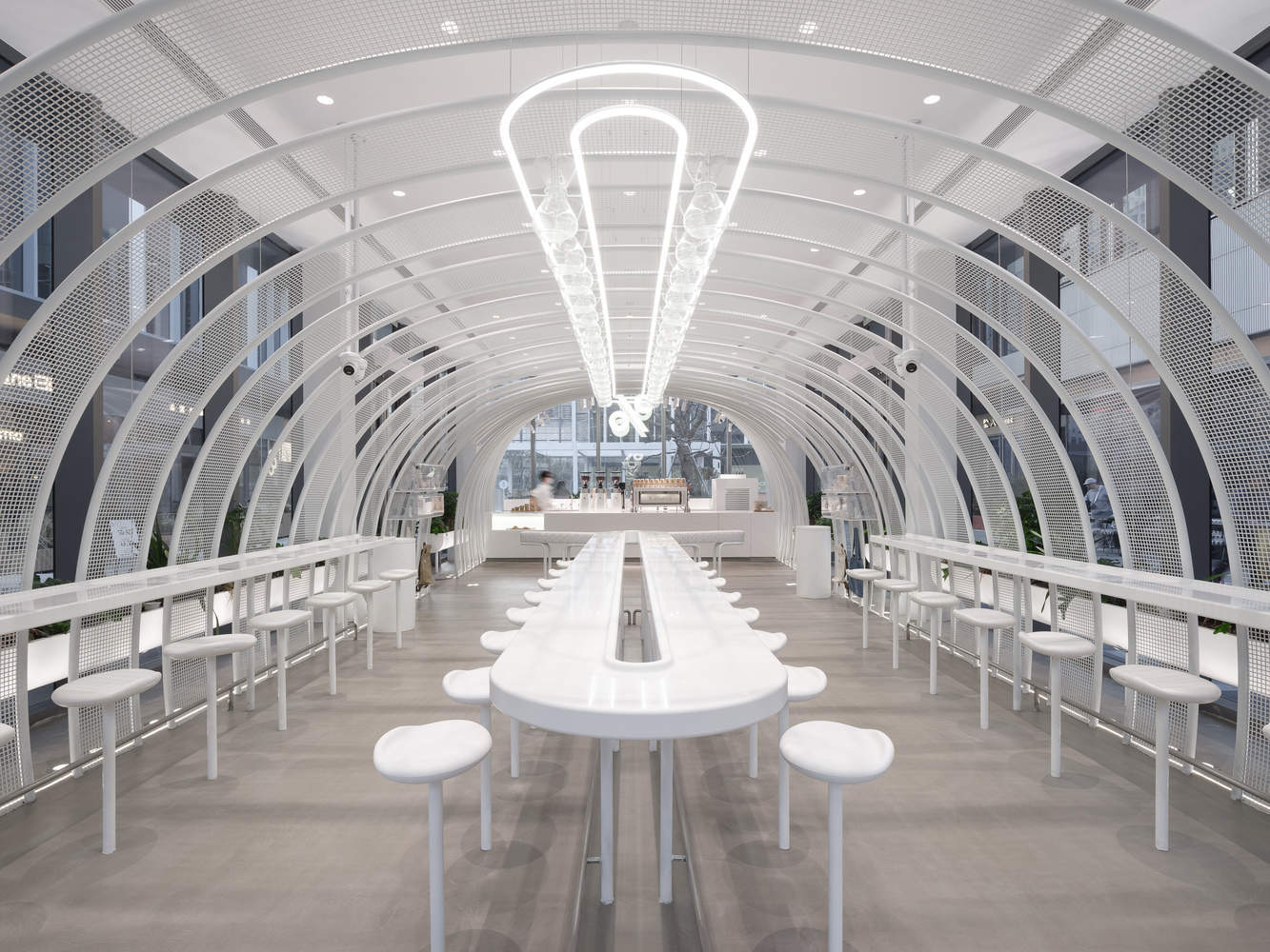Inspired by the idea of a pavilion and the philosophy of the brand, our approach is to simply create a range of white-painted mesh strips, which constantly change in size and shape, to achieve the effect of a tunnel that brings safe and cozy feelings for every person stepping in. The opacity of the mesh material plays a role as an ambiguous partition between indoor and outdoor seating to ensure adequate comfort and privacy.