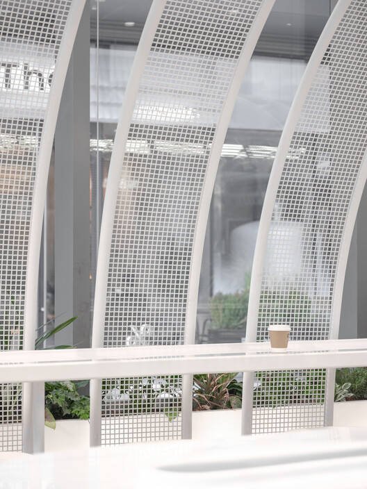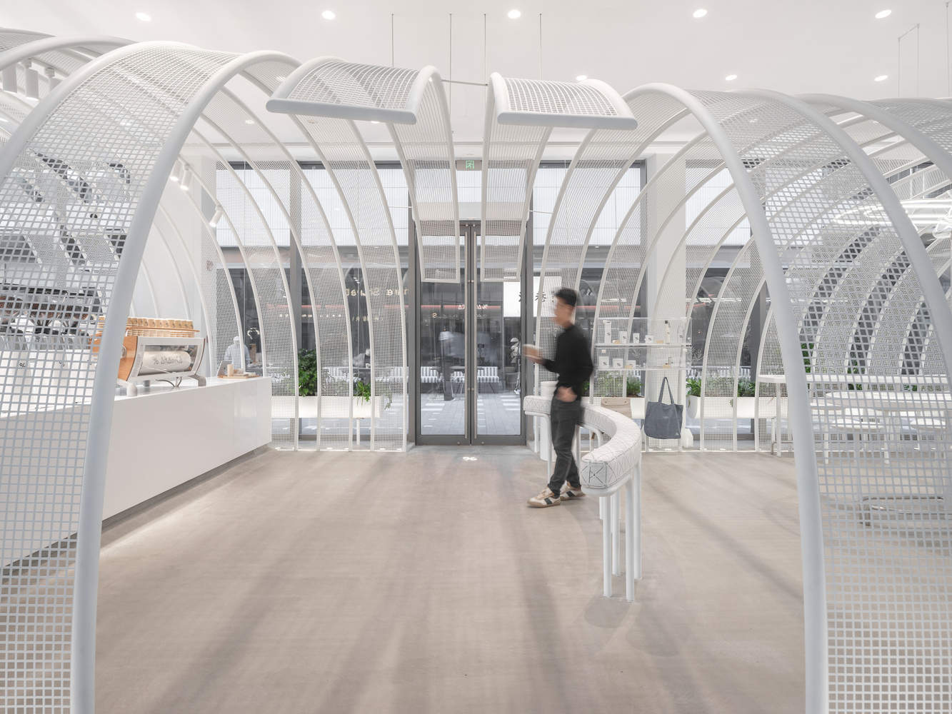 材质与视觉效果的创新:项目在材质运用上展现出创新思维。白色涂漆的网状条设计灵感来源于展馆理念和品牌哲学,通过大小和形状的变化,打造出隧道般的视觉效果,为顾客带来安全与舒适感。网状材料的不透明性模糊了室内外空间的界限,既保证了私密性,又增强了空间的连贯性。这种材质的运用不仅提升了视觉美感,还巧妙地解决了功能分区的问题。