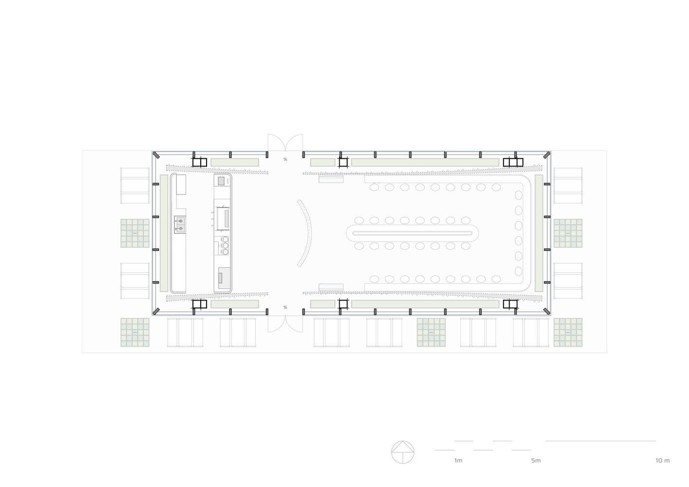 室内空间主要包括三层:家具、隧道和绿地,都遵循对称的布局。两个相对的入口门方便地将商店划分为两个空间:柜台和休息区,中间有一个弯曲的等候台,作为空间过渡的标志。当柜台“在聚光灯下”闪闪发光时,室内座位在悬挂的Chemex灯的灯光下被照亮了。