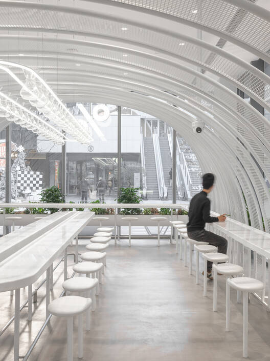 从外观上看,白色隧道在店内走动时,从顾客的角度来看,效果不同。户外家具的使用是为了确保其作为品牌标识的使命,是一种补充,而不是分散对设计核心元素的注意力。带有小植物的格子式花盆交错在座位之间,为聚集在一起享受户外氛围的每组人创造了必要的距离。