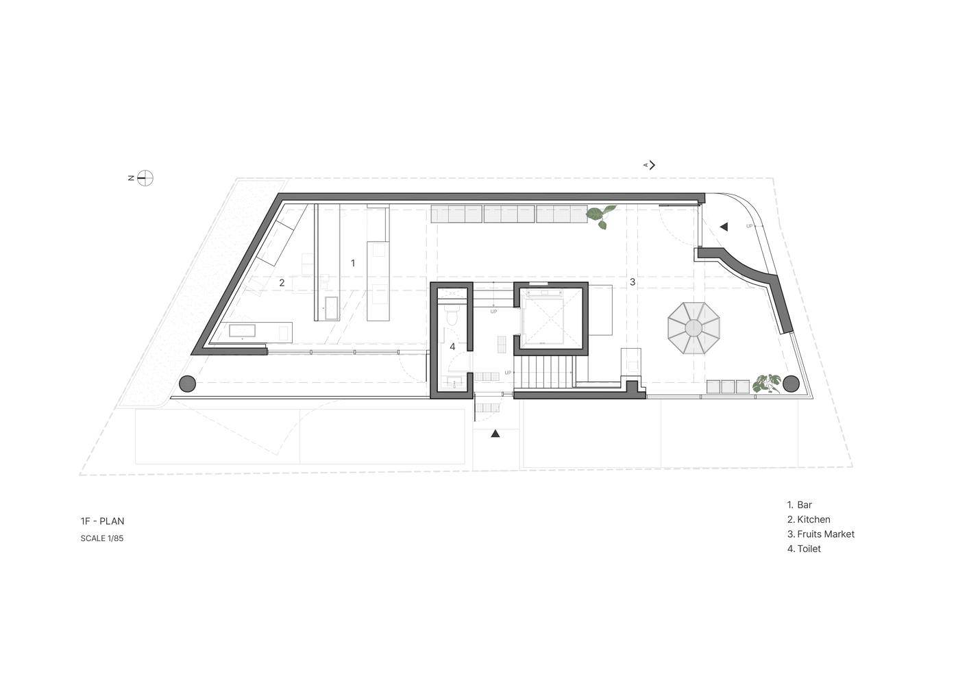 功能精髓-多用途空间的合理布局:该项目的布局充分考虑了功能的多样性与实用性。一楼的水果市场为顾客提供了新鲜的食材,而二楼的办公室则为运营提供了便利。三楼和四楼的休息区则为顾客提供了舒适的社交空间。这种分层布局不仅满足了不同顾客的需求,还通过植物的点缀和家具的巧妙布置,营造出一种温馨的氛围,使整个空间成为一个适合所有年龄段的共享场所。