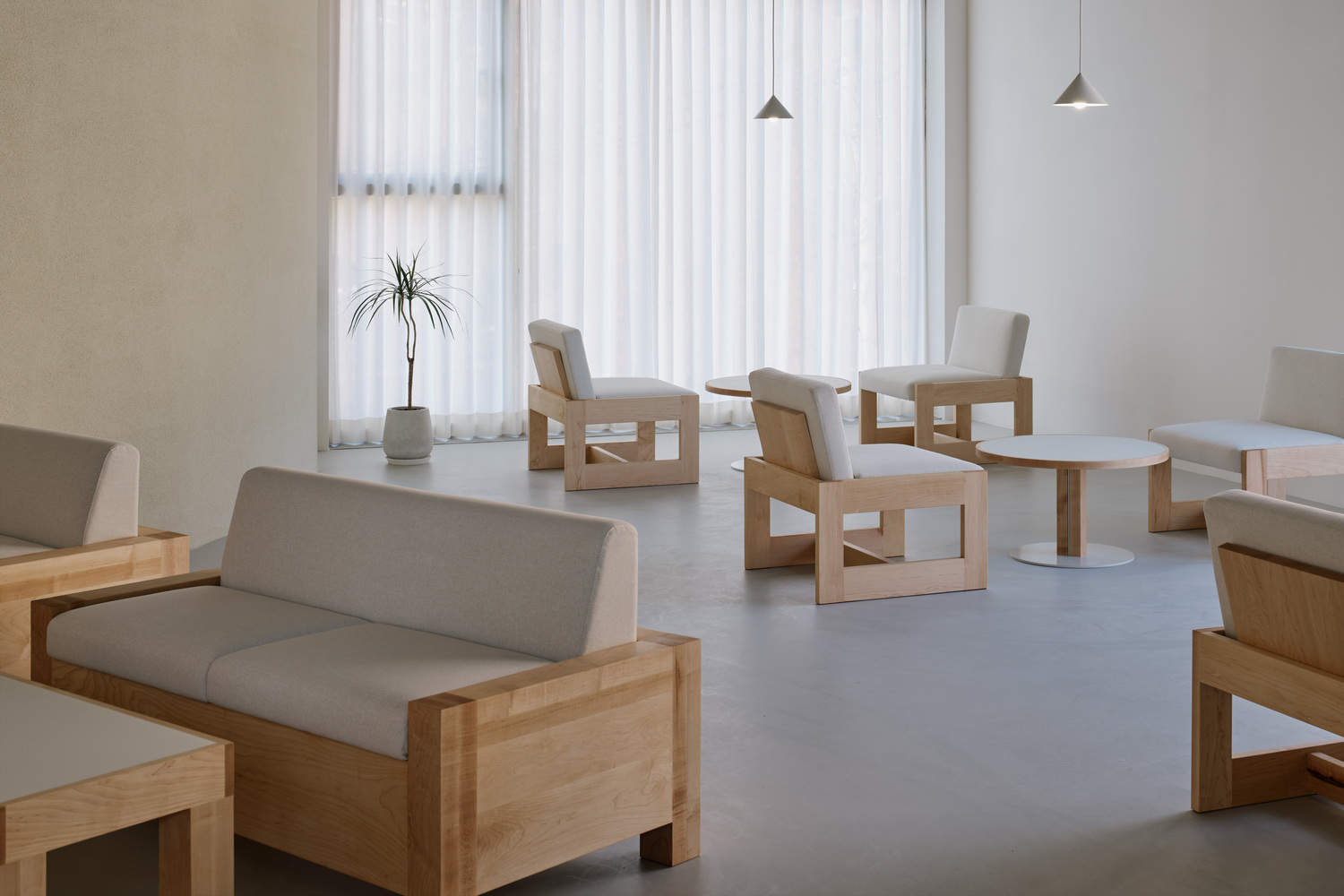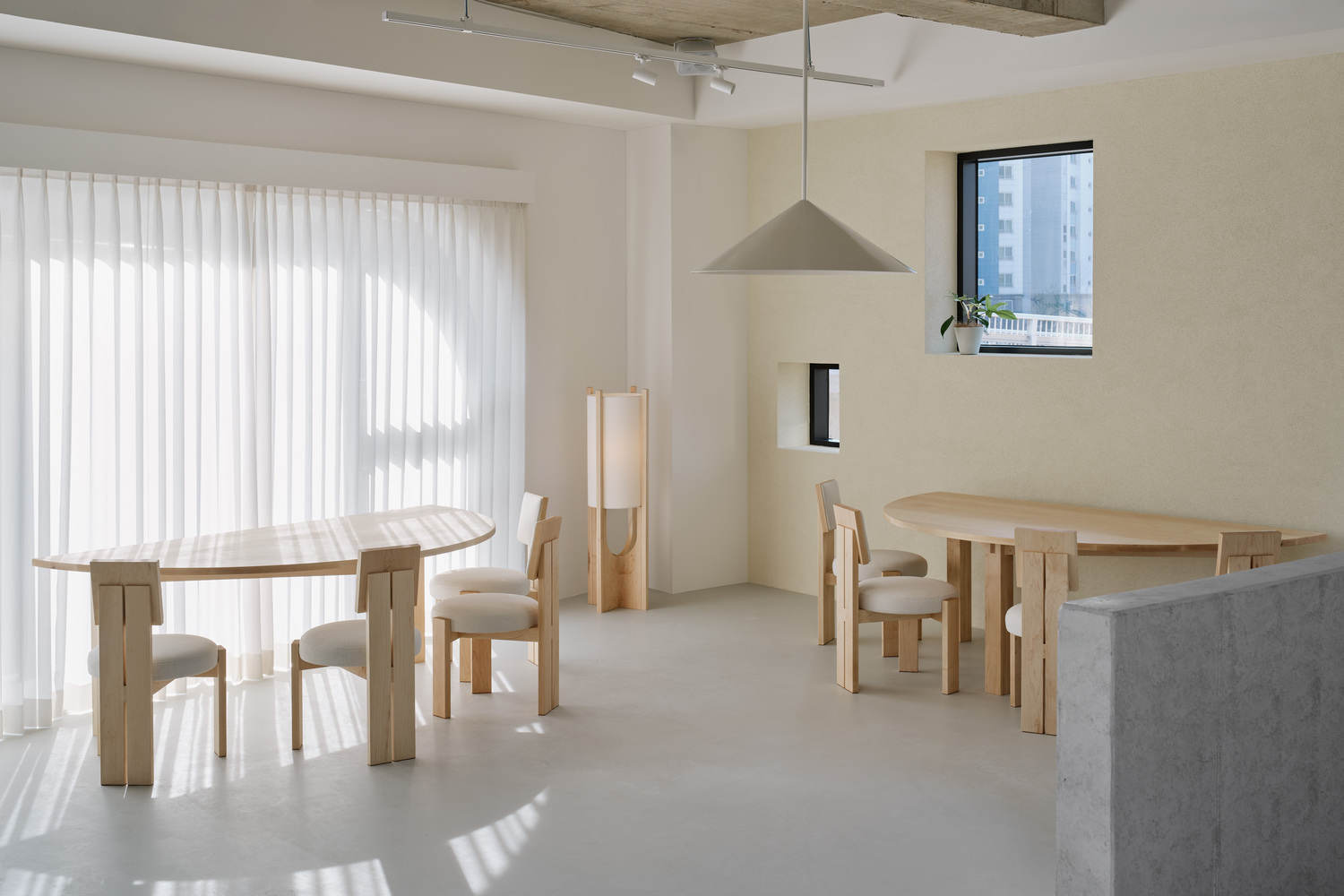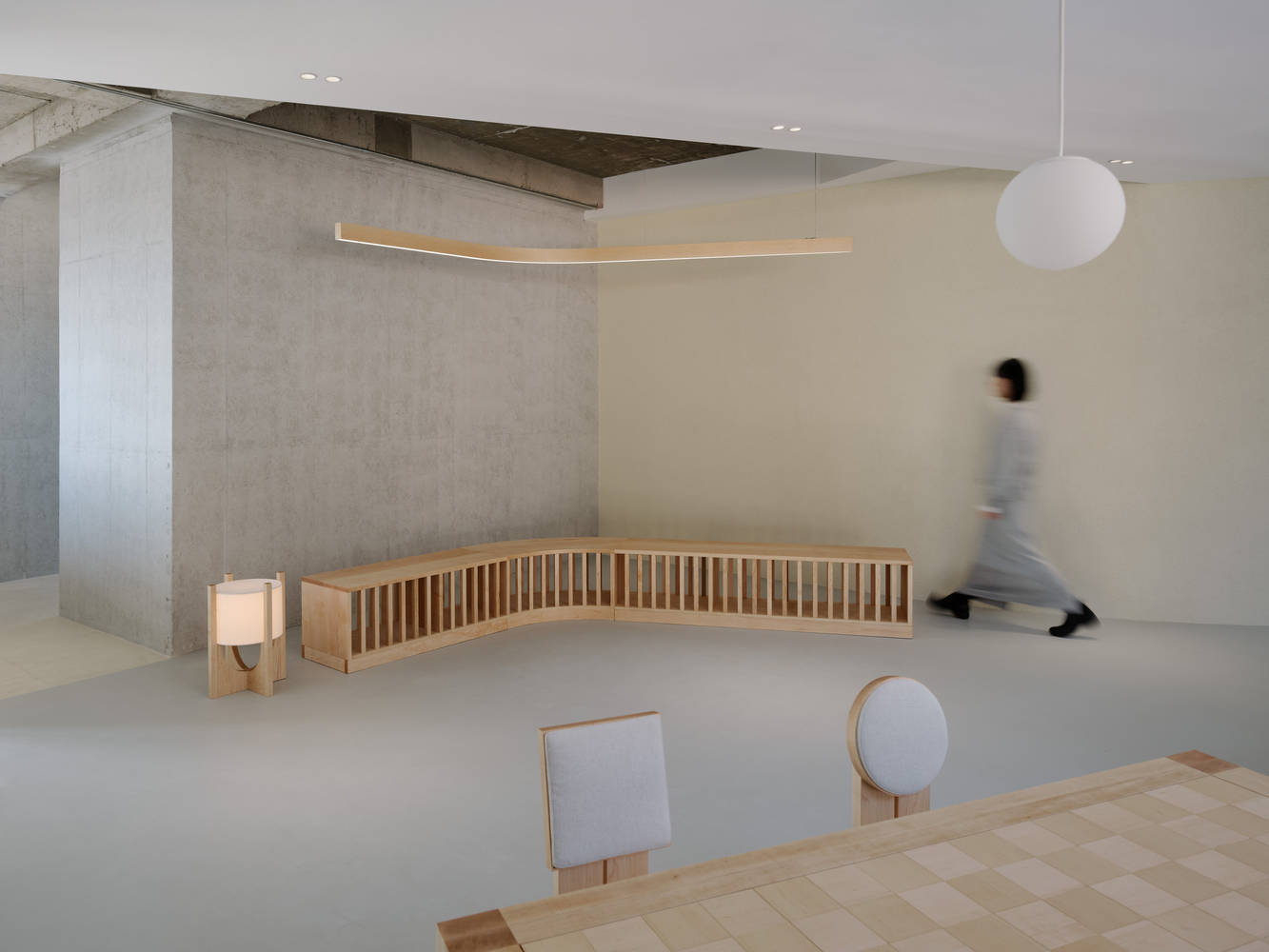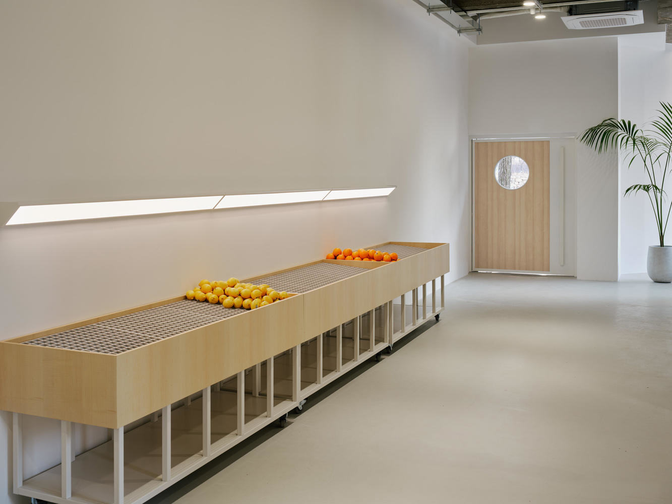 To that end, the design aimed to retain as much of the original concrete finish as possible while creating visual and affective balance with the space's main material, maple hardwood. The sensibility of this balance reaches fruition when the colorful fruit is placed in the space. This connectivity exists not only on the ground floor but also on all floors above it. The scattering of plants of a variety of sizes was intended to maintain this balance instead of fruit and add a touch of warmth and texture.