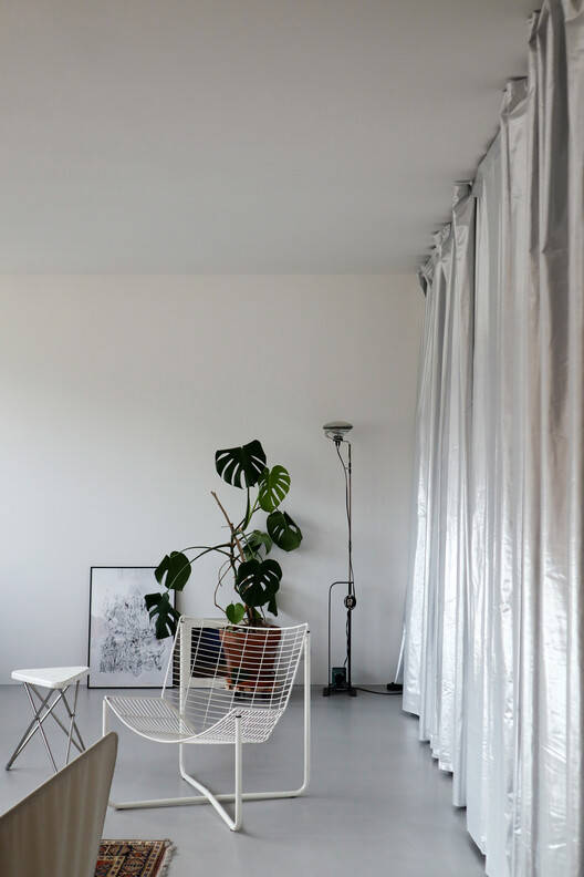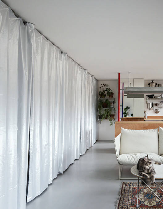 客厅变成了一个大房间,充分利用了玻璃幕墙。同时,床、储藏室、入口和浴室都放在公寓后面的一条带里,隐藏在一系列窗帘后面。