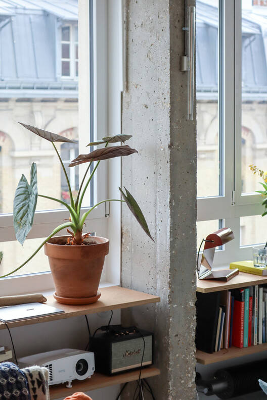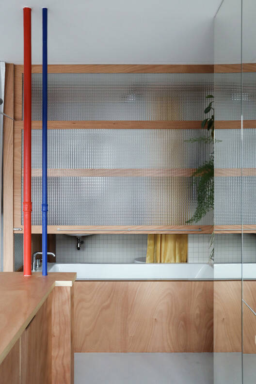 To overcome the problem of air renewal in this mono-oriented typology, and to allow maximum viewing of a single room, the bathroom features an imposing sash window. This creates a direct link with the rest of the living space, allowing air to circulate and sun to shine in the bath on summer days.