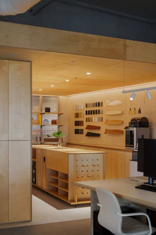 自然与工艺的融合:该项目成功地将品牌对自然和精湛工艺的尊重融入到空间设计中。大量使用桦木胶合板,不仅营造出温暖自然的氛围,还通过精心的分区设计,让每个功能区域都显得恰到好处。这种材料选择和空间布局的结合,展现了设计团队对细节的关注和对整体美学的把控,为使用者提供了一个既舒适又富有灵感的工作环境。