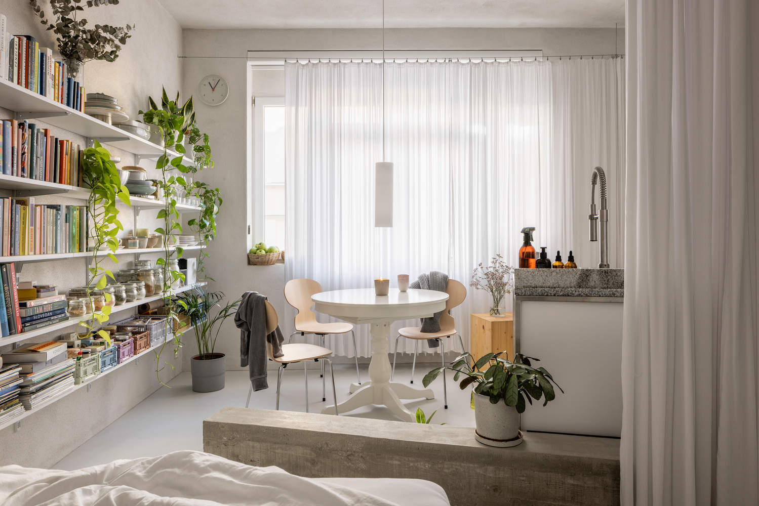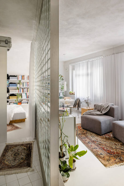 我们说过光很重要。一个新的日间小公寓,将有两个漂亮的大窗户。在最初的布局中,每个窗户都属于一个房间,形成了一个黑暗的走廊。一个明亮的大空间,只由房子的立面和后面的透明玻璃砖墙界定,后面是公寓舒适运行所需的一切——带淋浴、洗衣机、水槽、橱柜和储物空间的浴室。
