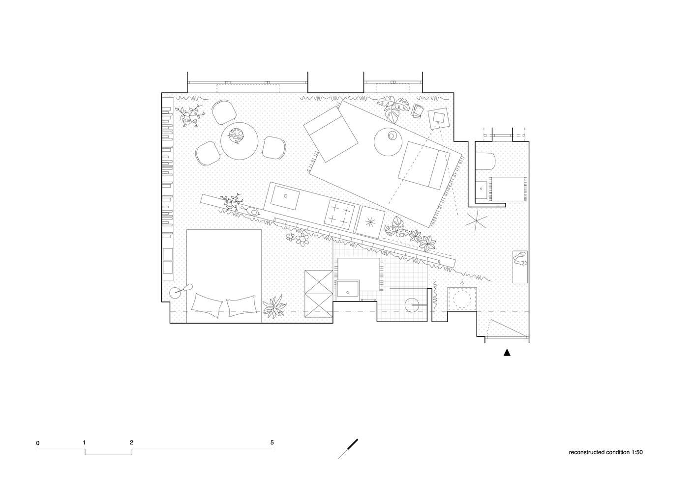 卧室是唯一一个位于两个世界边界的地方。在公寓尽头的位置,它不再是玻璃砖墙,而是以墙壁的形式继续有一个混凝土底座,用于座位和窗帘,微妙地暗示我们在公寓的一个更亲密的地方。然而,与此同时,我们可以看到外面,厨房和餐厅,正在放映一部电影。如果我们愿意。