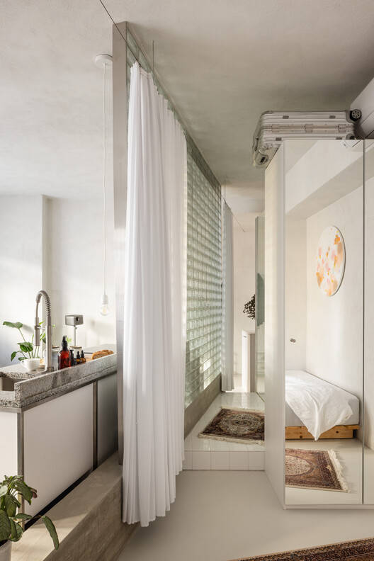 光线与空间:这个项目最引人注目的特点是其对光线的巧妙利用。设计师通过将两个窗户的房间设计成一个整体,以最大限度地利用自然光,避免了黑暗走廊的产生。这种设计体现了对空间和光的深度理解,以及对如何通过建筑来优化居住体验的深刻思考。它不仅仅是一个公寓,更是一个关于空间、光线、洞察力和它们共同创造的时刻。项目通过将光线引入内部,创造出明亮通透的空间,并通过透明的玻璃砖墙来分隔空间,既保留了隐私,又保持了开放性。这种设计理念充分利用了光线,营造了一个开放、明亮、通透的居住空间,彰显了对空间和光的独到见解。