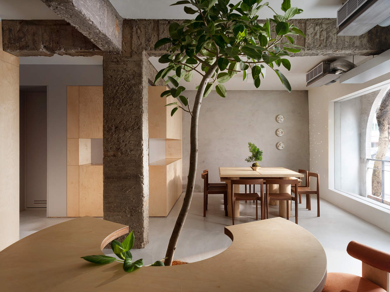 The original beams and columns symbolize the essence of the old, contrasting with the fresh woodwork and wooden furniture that embody the new. Indoor greenery echoes the lush view through large windows, creating a harmonious dialogue. The central island-style bar, featuring playful orange tiles and rectangular blocks interwoven with tiered shelving, adds a dynamic visual appeal. Here, guests can enjoy their meals while experiencing the vivid rhythm of everyday life that integrates seamlessly with the locale.