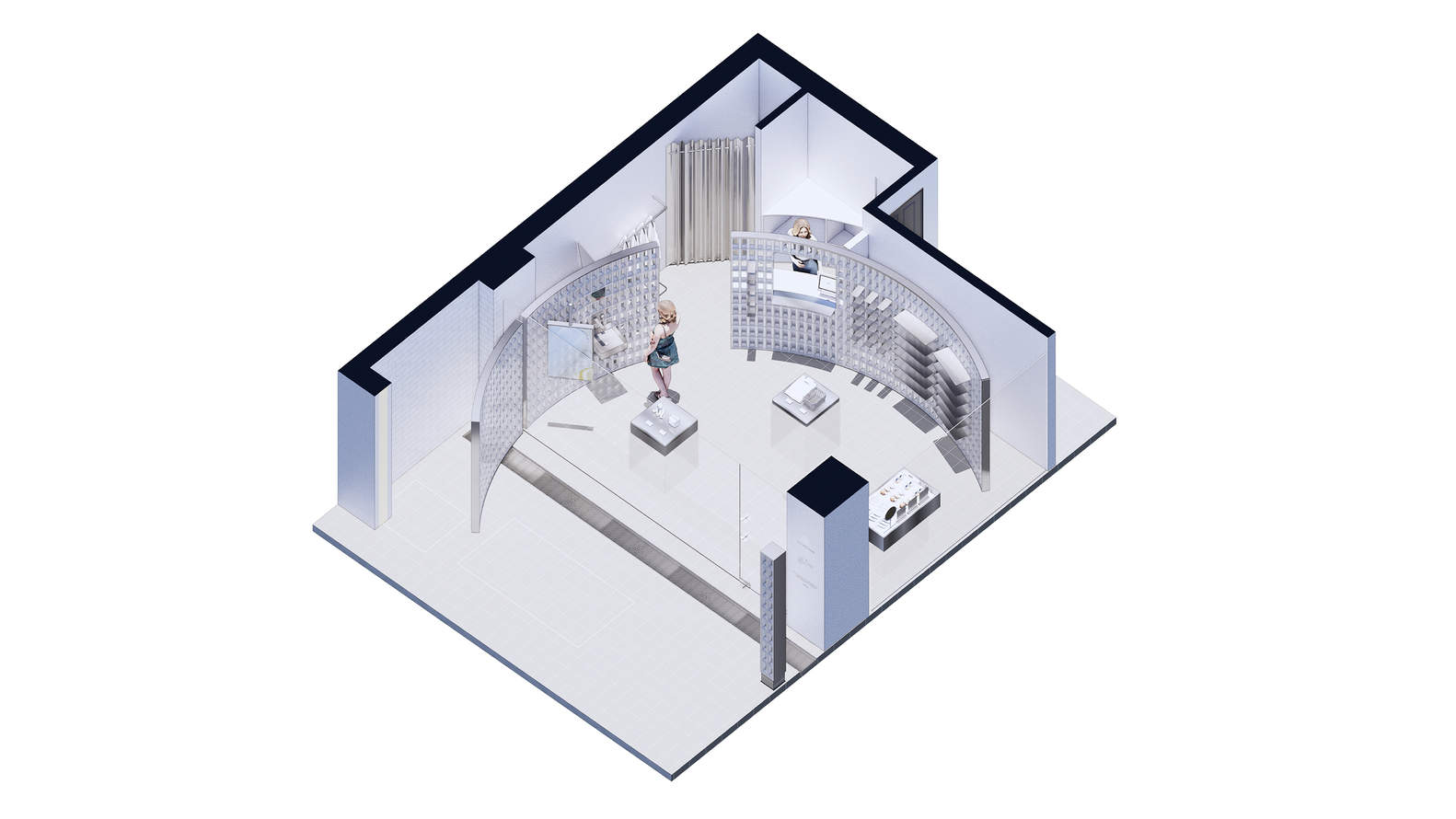 展厅的一个突出建筑元素是弯曲的玻璃屏障。从远处,引导目光自然地进入空间。除了美学价值外,隔断还有一个功能目的,将展厅巧妙地划分为不同的区域,供客户和员工流通。虽然前部用于产品展示,但玻璃隔板后面的柜台和更衣室等私人空间保证了隐私和实用性。将水槽和架子直接安装在玻璃上存在技术挑战,但他们决心在风格和功能之间取得平衡。
