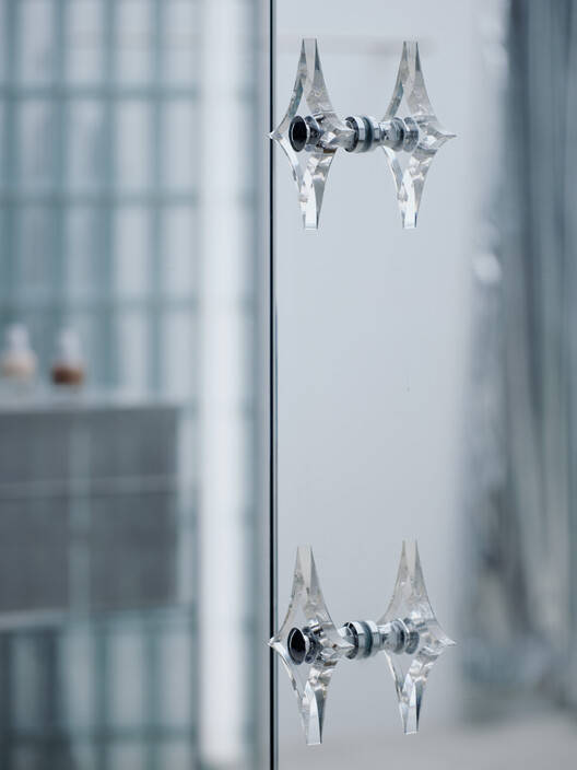 玻璃作为主要材料的选择,完美地传达了品牌的精神。室内和室外之间的边界被透明玻璃模糊了,透明玻璃将视觉流延伸到墙壁、天花板和地砖上。这种设计方法创造了一种连贯的叙事,将23平方米的朴素室内与室外环境联系起来。