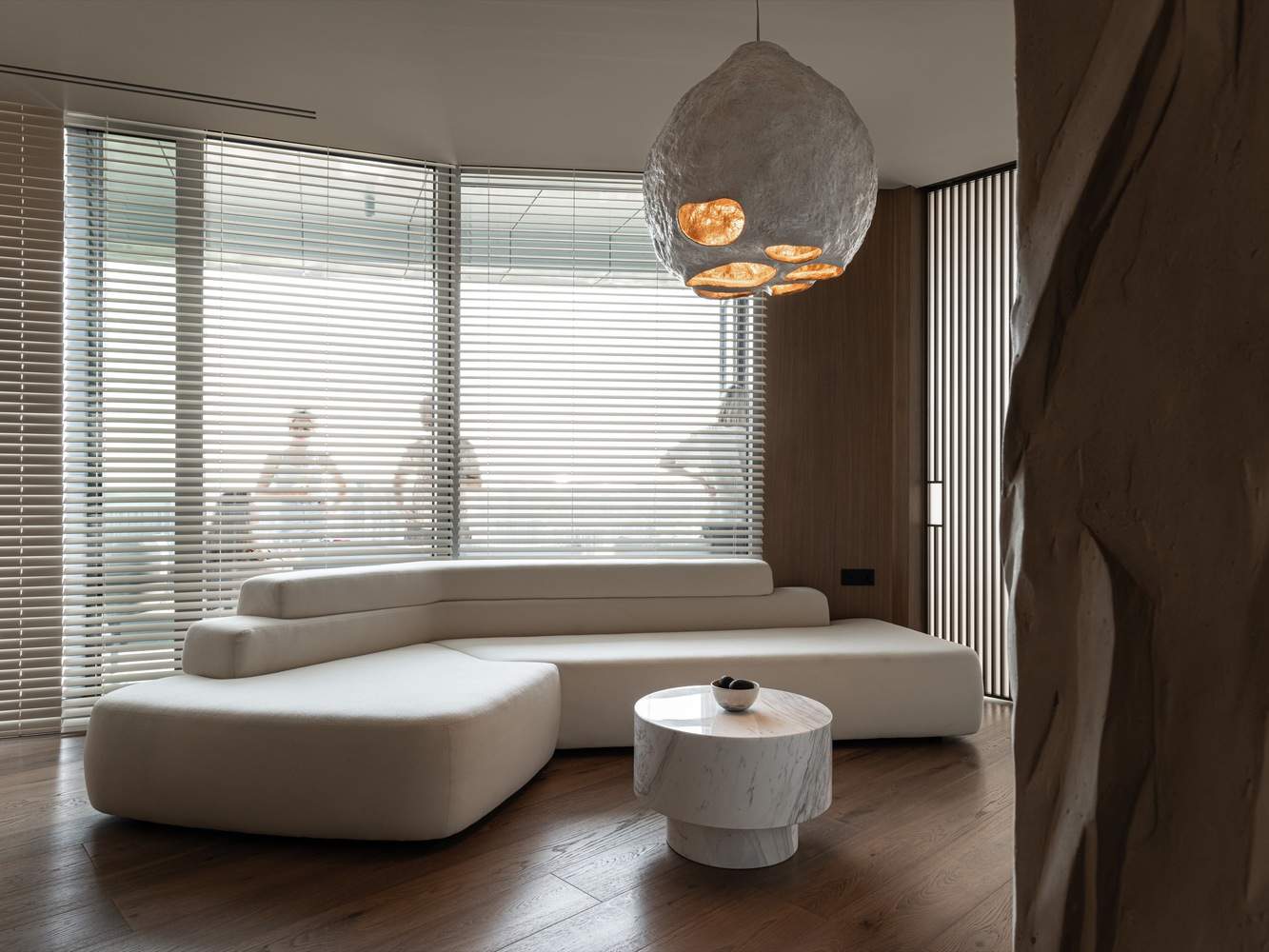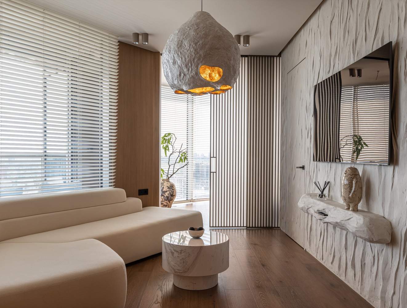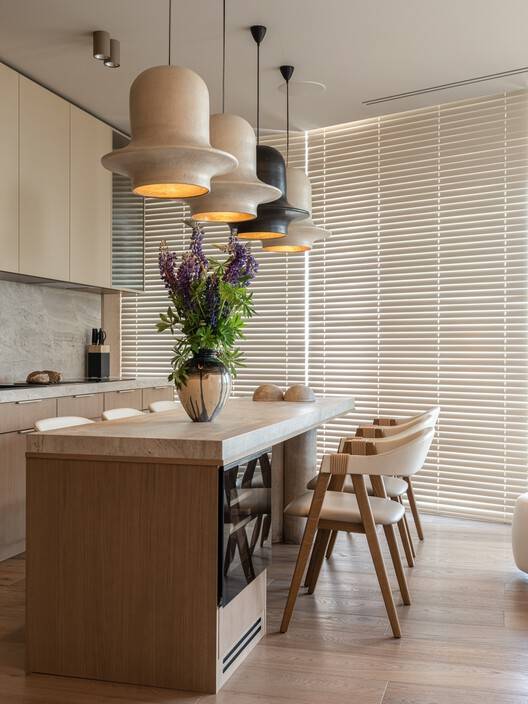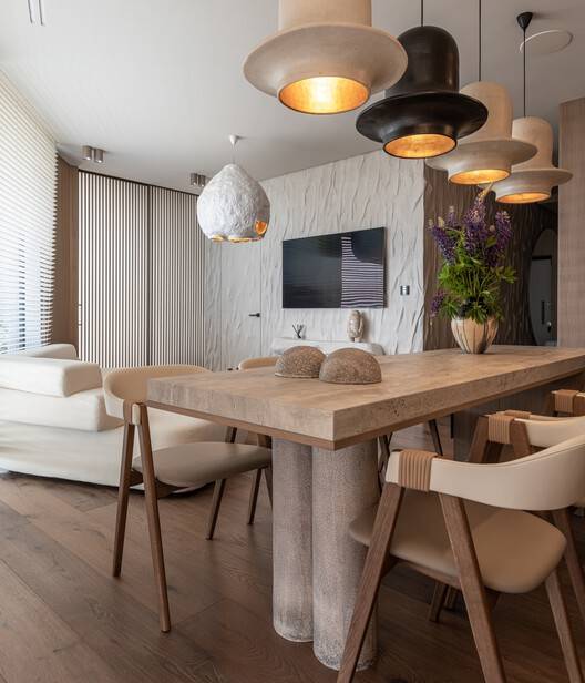 这间公寓拥有极简主义的家具和自然纹理,散发着轻松优雅的气息。家具光滑、光滑的线条以及木材、石头和陶瓷的和谐结合,创造了一种和谐与平衡的感觉,舒缓了灵魂。