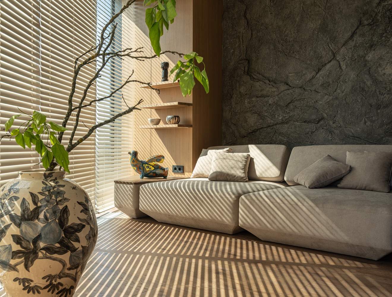自然与极简的融合:OSONNIA公寓的设计展现了自然与极简主义的完美结合。极简家具与自然纹理的搭配,如木材、石头和陶瓷的和谐运用,营造出一种宁静而优雅的氛围。这种设计不仅体现了对材料的深刻理解,还通过细节的精心策划,将居民包围在一个舒缓灵魂的空间中。每一个元素都经过精心选择,以确保整体的和谐与平衡,为居住者提供了一个放松身心的避风港。
