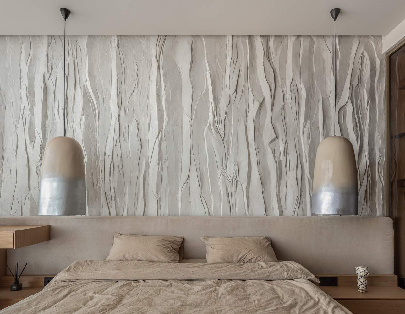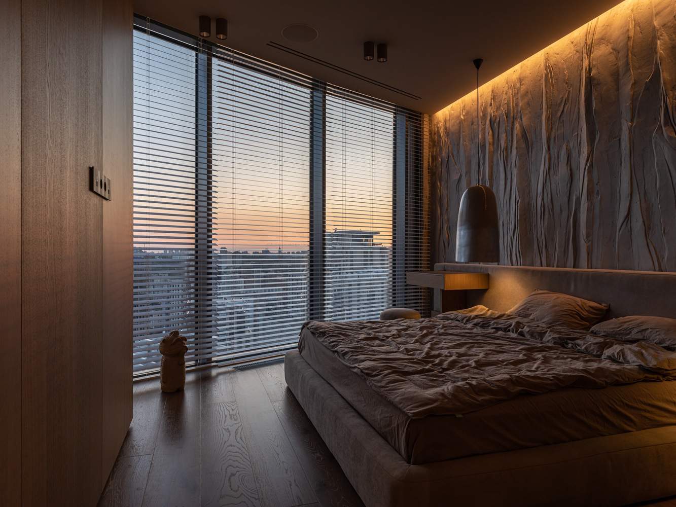 The bedroom of the OSONNIA apartment is a sanctuary of serenity, adorned in light, natural beige tones. Ceramic furniture and the texture of wild stone combine to create an atmosphere of ultimate comfort and security. The soft glow of the LAKUNA lamps, positioned on either side of the bed, lulls residents into a state of blissful relaxation. A meticulously designed wardrobe and an opulent bathroom complete this luxurious haven, offering an escape from the world outside.