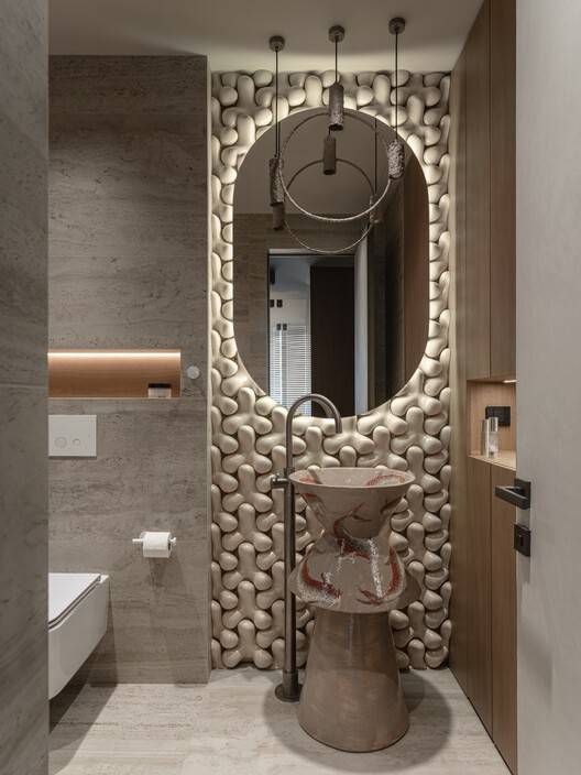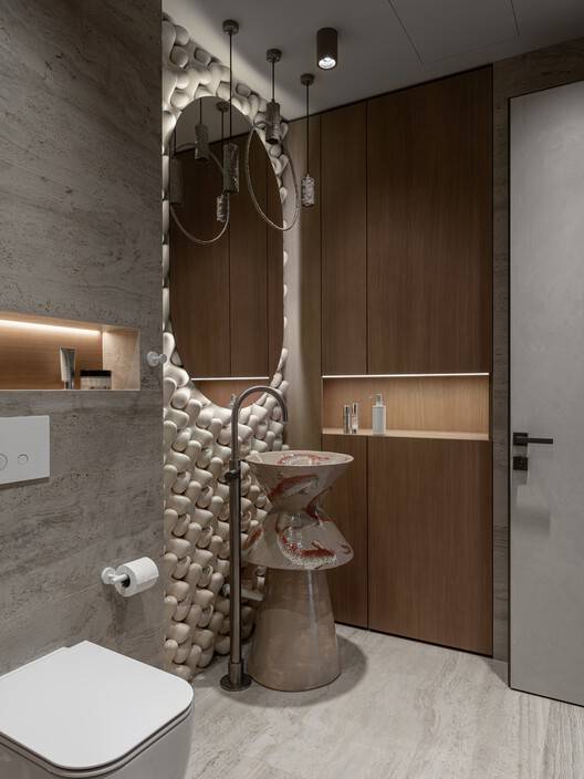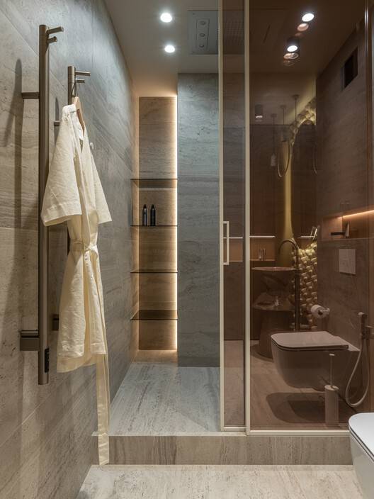 空间优化与功能创新:MAKHNO工作室在空间设计上展现了卓越的创造力。通过扩大主卧室、衣柜和浴室等关键区域,公寓不仅提供了充足的放松和储物空间,还通过优化走廊尺寸,使内部流动更加流畅。此外,工作室在不牺牲生活空间的前提下,巧妙地引入了洗衣房和客用浴室等功能,进一步提升了居住的便利性和实用性。这种对空间的重新思考和优化,体现了设计对居民需求的深刻洞察。