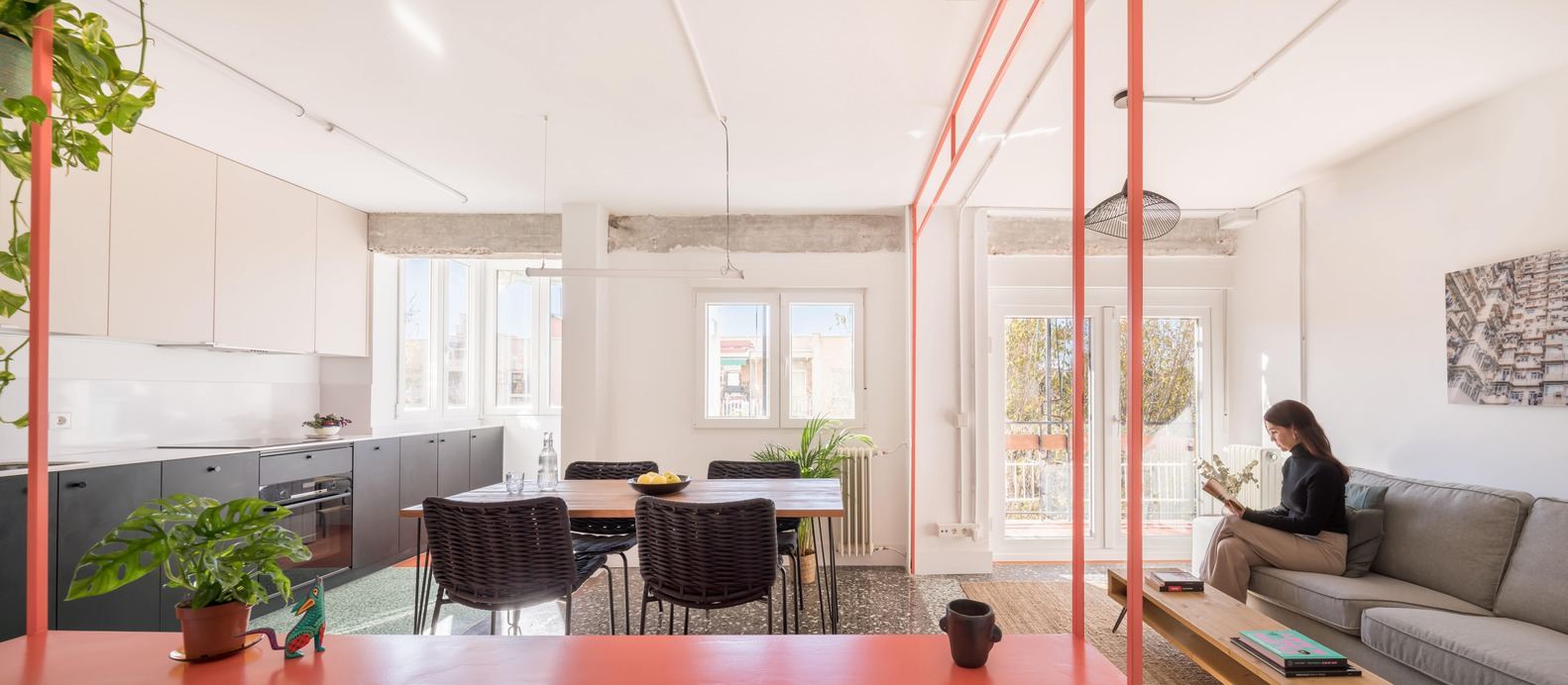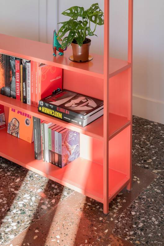 The open area is a multifunctional space for cooking, dining, or working. Here, the uses are delineated by a colour-lacquered iron shelving unit that adds personality and seamlessly integrates with the rest of the materials. It functions as a dynamic element that stores, separates, or connects throughout the space.