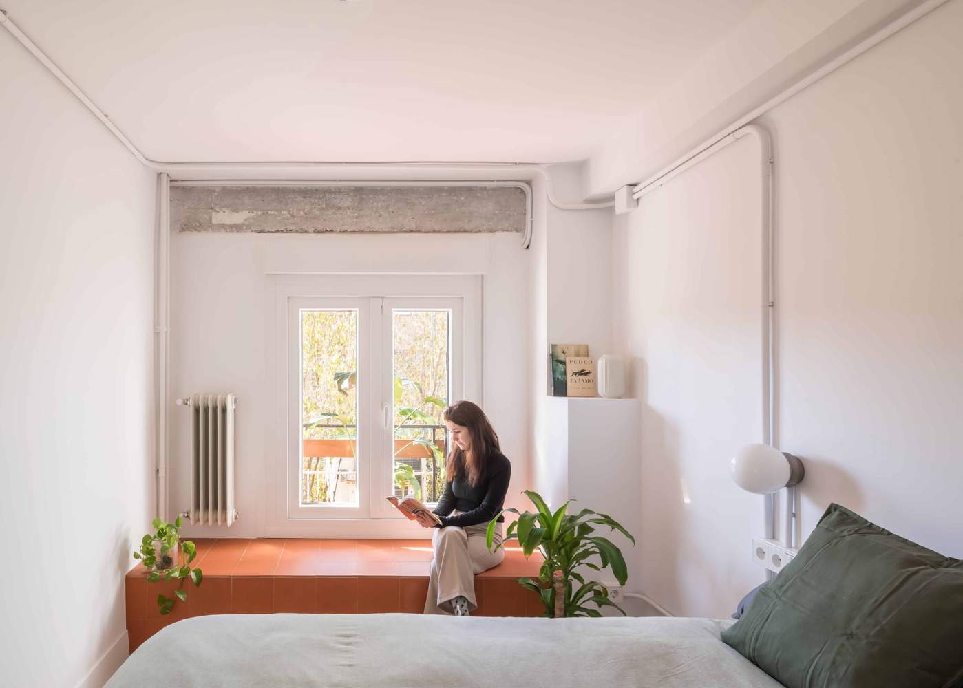 The bedroom maintains the warmth of the original parquet flooring and is conceived as a neutral space, with the only standout feature being a raised platform clad in terracotta for reading and meditation, connected to the outdoors.