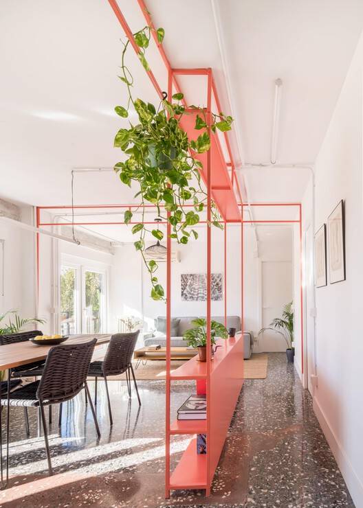 开放区域是一个用于烹饪、用餐或工作的多功能空间。在这里,这些用途由一个彩色涂漆的铁架单元来描绘,该单元增添了个性,并与其他材料无缝集成。它作为一个动态元素,在整个空间中存储、分隔或连接。