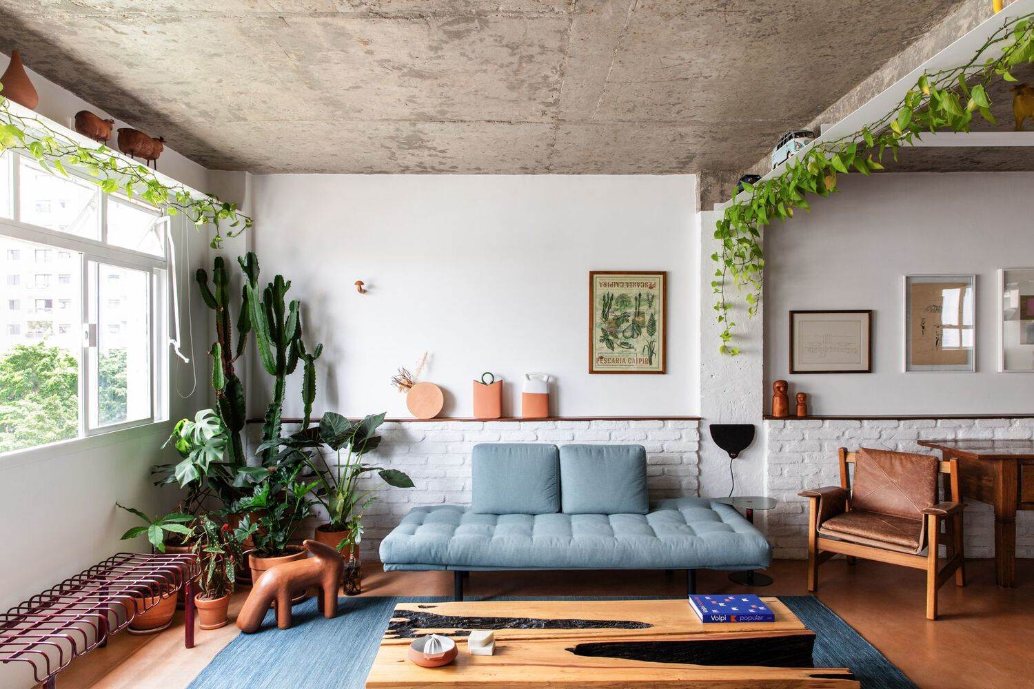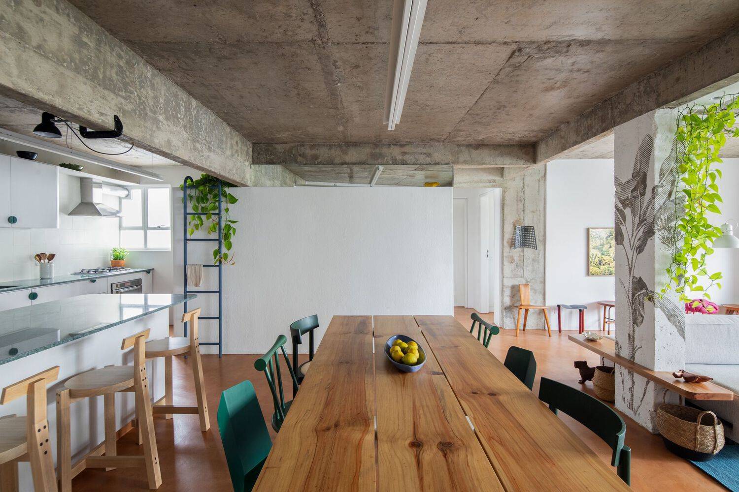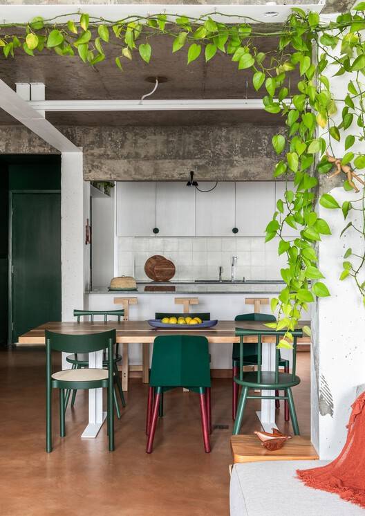 The apartment furniture alternates between new pieces and family items, Studio Pedro Luna's line items, and unique pieces that Pedro made with fallen tree wood, such as the coffee table and dining table. The living room has a square layout composed of two sofas, an armchair, a bench, and a coffee table, seeking a pleasant conversation circle. A rectangular table, with a wooden top and metal legs, completes the dining area with 6 green chairs, alternating between three different models: enxada, gravatá, and pedrita chairs.