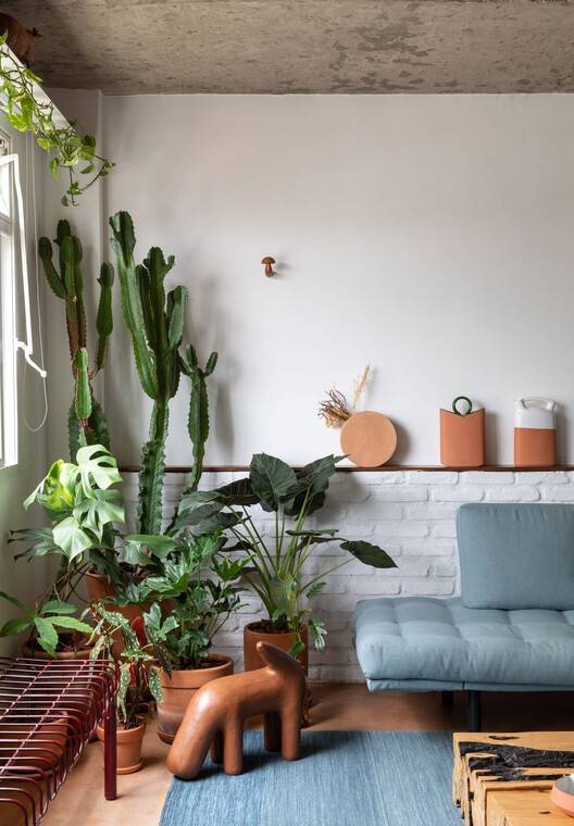 The shelves, in addition to solving the lighting, serve as support for production and plant support. As we wanted to leave the floor free while also liking plants very much, we chose to hang them: metal hooks with magnets support the jibóias and yellow philodendrons, making it easy to change their positions as they grow. Finally, the folds of the shelves also function as curtain rods for the living room's roll-ons.