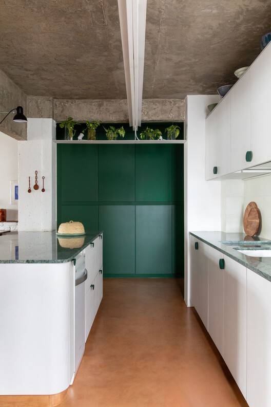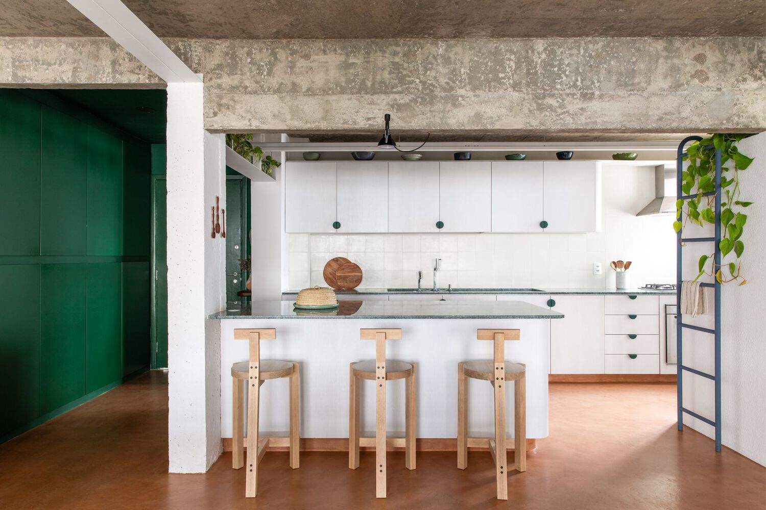 The kitchen has a functional layout, with a large island for cooking and stools for quick meals. Appliances such as a refrigerator, stove, hood, electric oven, and microwave are hidden on the right side. The idea was for the kitchen to have a clean view from the living room, with only the cabinets visible. The kitchen gained color with the green quartzite del mare countertop, and white unfolds in various textures: natural wood veneer stained white on the cabinets and the back of the countertop covered in hydraulic tile. The cabinet handles were designed by us and made of laser-cut metal sheets with green electrostatic paint.
