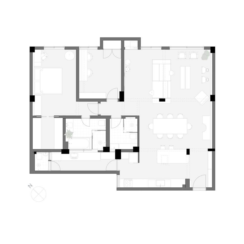 最大的挑战是创建一个满足我们需求并充分利用现有结构的布局。保留了天然气和供水点,以降低建设成本。此外,由于板材被剥离,天花板照明点的分布也变得困难。大厅、厨房和一间卧室向客厅开放,创造了一个宽敞而完整的空间。一条绿色的隧道标志着大厅,通过家具进行用途分区。岛式沙发将客厅和电视区隔开,餐桌将厨房和客厅隔开。