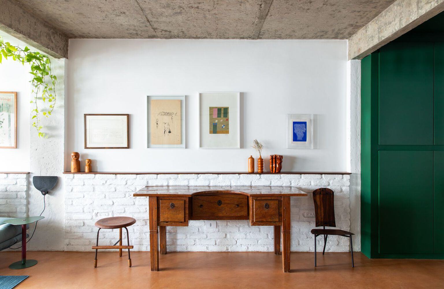A brick wall extends through the dining room and living room, serving as a support for decorative objects. The bricks came from the demolition of a wall in Carolina's brother's apartment (a project that was happening simultaneously with hers). Since they came out intact, we put them in the car and used them in this project. And to give it a finishing touch, a wooden shelf made from the old apartment floor was placed on top of the wall.