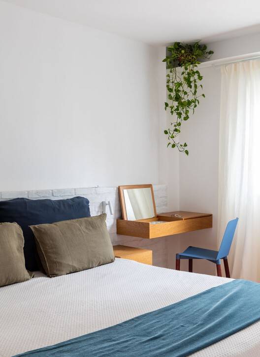 宽敞简约是我们对主卧的渴望。为了实现这一目标,我们拆除了旧壁橱,并创建了新的壁橱,我们将女佣房间的入口改为套房。我们按照与办公室相同的简洁语言设计床头柜,一方面,它们变成了梳妆台。床头板也是用拆除砖制成的,沿着房间的整个墙壁延伸。浴室铺着蓝色的液压瓷砖地板,台面比以前小,为花盆腾出了空间。