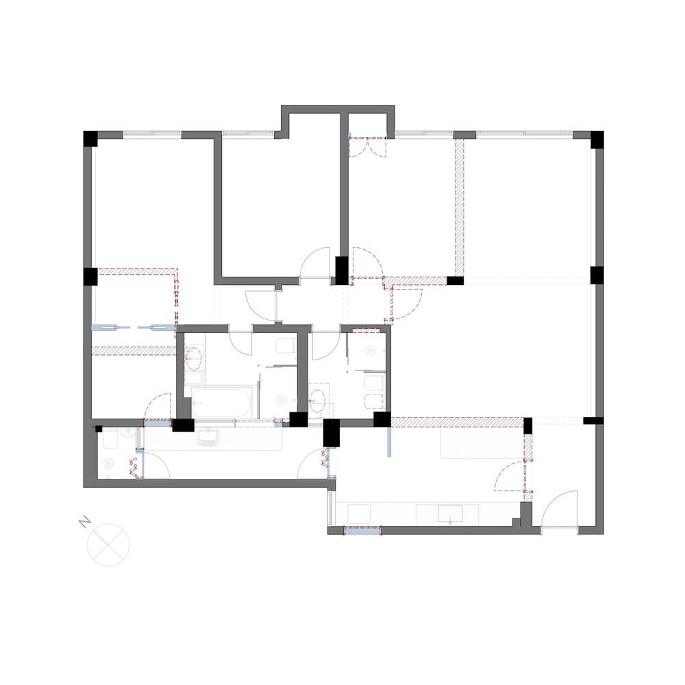 空间重塑与功能整合:该项目最显著的亮点在于对原有空间布局的颠覆性改造。设计师巧妙地打破了传统的封闭式厨房、女佣房和三卧室结构,转而打造出一个开放、流畅的居住空间。通过将厨房、客厅和部分卧室打通,创造了宽敞的公共区域,满足了现代生活方式的需求。这种空间重塑不仅提升了居住体验,也使整个公寓更具通透感和互动性。此外,对现有结构的充分利用,例如保留天然气和供水点,体现了对成本控制的有效考量,并在满足功能需求的基础上,实现了空间的最大化利用。