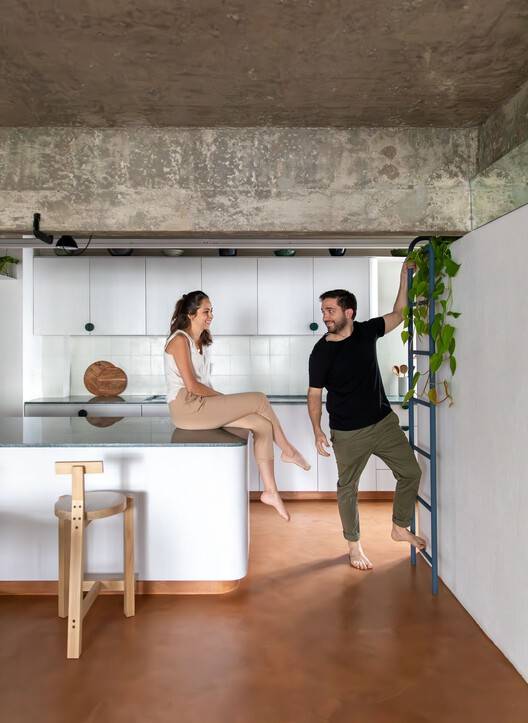 The refrigerator volume does not reach the ceiling, and a planter was created on top of it. Playful access to water the plants is done through a metal sailor ladder. To create alignment with the bathroom volume, we used mirrors that reflect the stripped slab, giving the feeling that this volume is also detached from the ceiling.