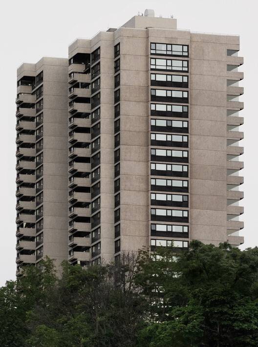 Text description provided by the architects. Now dividing his time between practice and teaching at the School of Architecture of Laval University in Quebec City, architect Jean Verville, appealed by the brutalist architecture punctuating the national capital with significant buildings, established his creative laboratory in a residential tower, designed in the 1970s by architect Marcel Bilodeau, and standing out as a monumental sculpture facing the Plains of Abraham Park. The rehabilitation of a compact 79m unit is deployed in an architectural experiment orchestrating a space with a graphic dimension. Like an observation post offering breathtaking views of the Laurentian Mountains, the urban landscape, and the St Lawrence River, the interior comes alive with an immutable body-to-body relationship between transparency and reflection, while transforming realities through distancing and multiplication.