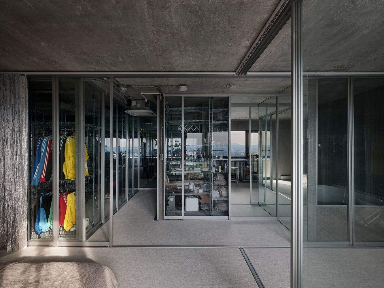 First, a complete curettage is prescribed by a necessary upgrade. Thus, freed from all construction systems and obsolete equipment, the unit reveals a monolith of raw concrete, pierced with openings to the north and south. Taking advantage of the crossing typology, the mineral materiality, the natural luminosity, and the electromechanical systems essential to the functioning of the habitable space, an architectural device, formed of a serial composition of sliding glass walls, allows fluid reconfigurations while thwarting perceptions of size. The strategic positioning of domestic equipment maintains constant physical and visual permeability to neutralize the compactness of the unit.